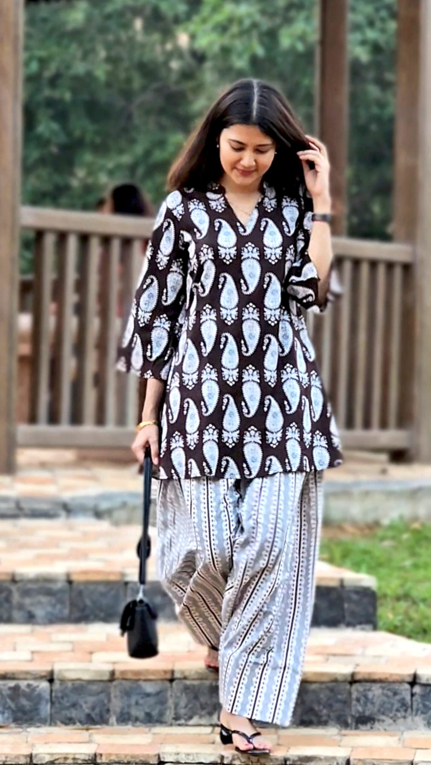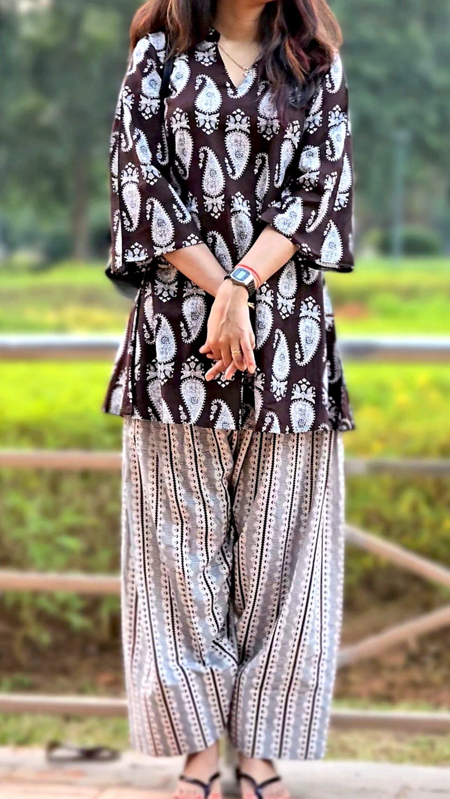 Discover effortless elegance with the Aaranya – Brown & Cream Paisley Print Coord Set. This beautiful set combines a paisley-patterned brown tunic with matching cream and brown striped pants, creating a harmonious look that is both stylish and comfortable. Crafted from soft, breathable fabric, this coord set ensures all-day comfort while giving you a trendy, put-together appearance. Ideal for casual outings, relaxed days at the park, or any occasion where comfort meets style, the Aaranya set offers versatility with a timeless ethnic design. Pair it with minimal accessories for an easy, chic look, or add a statement piece to elevate the ensemble.