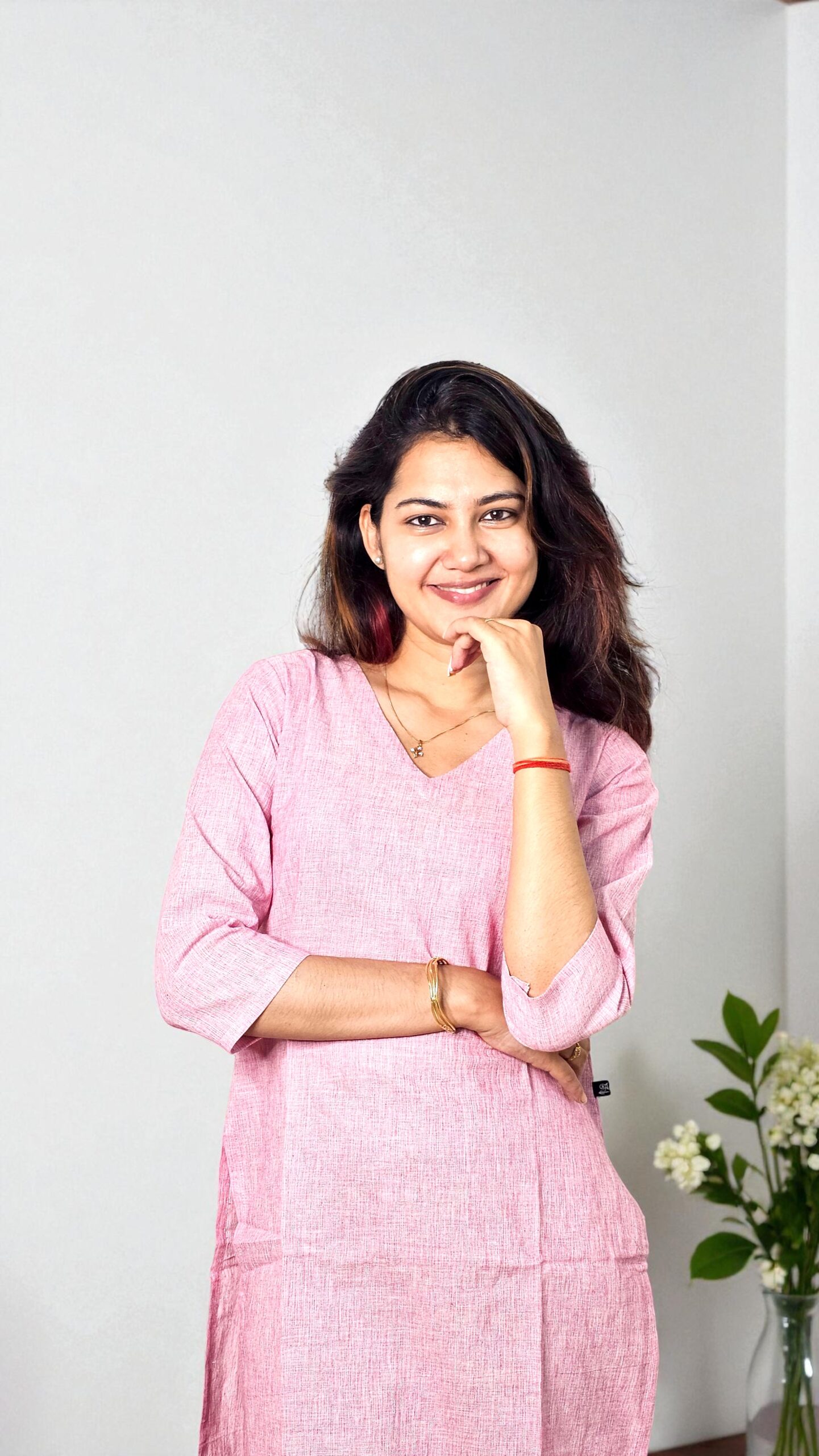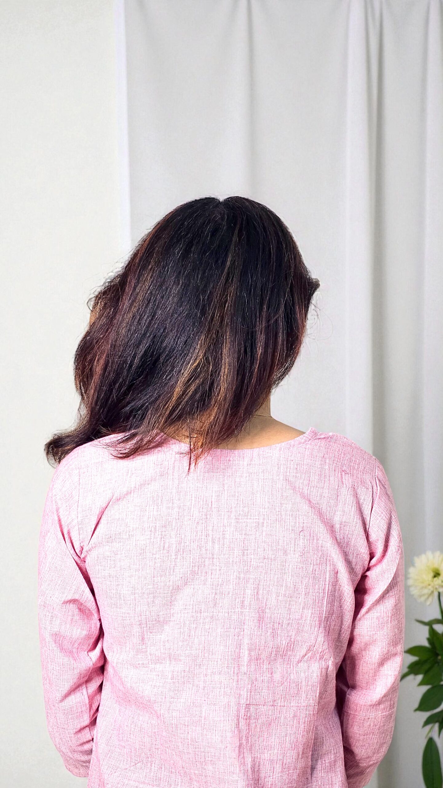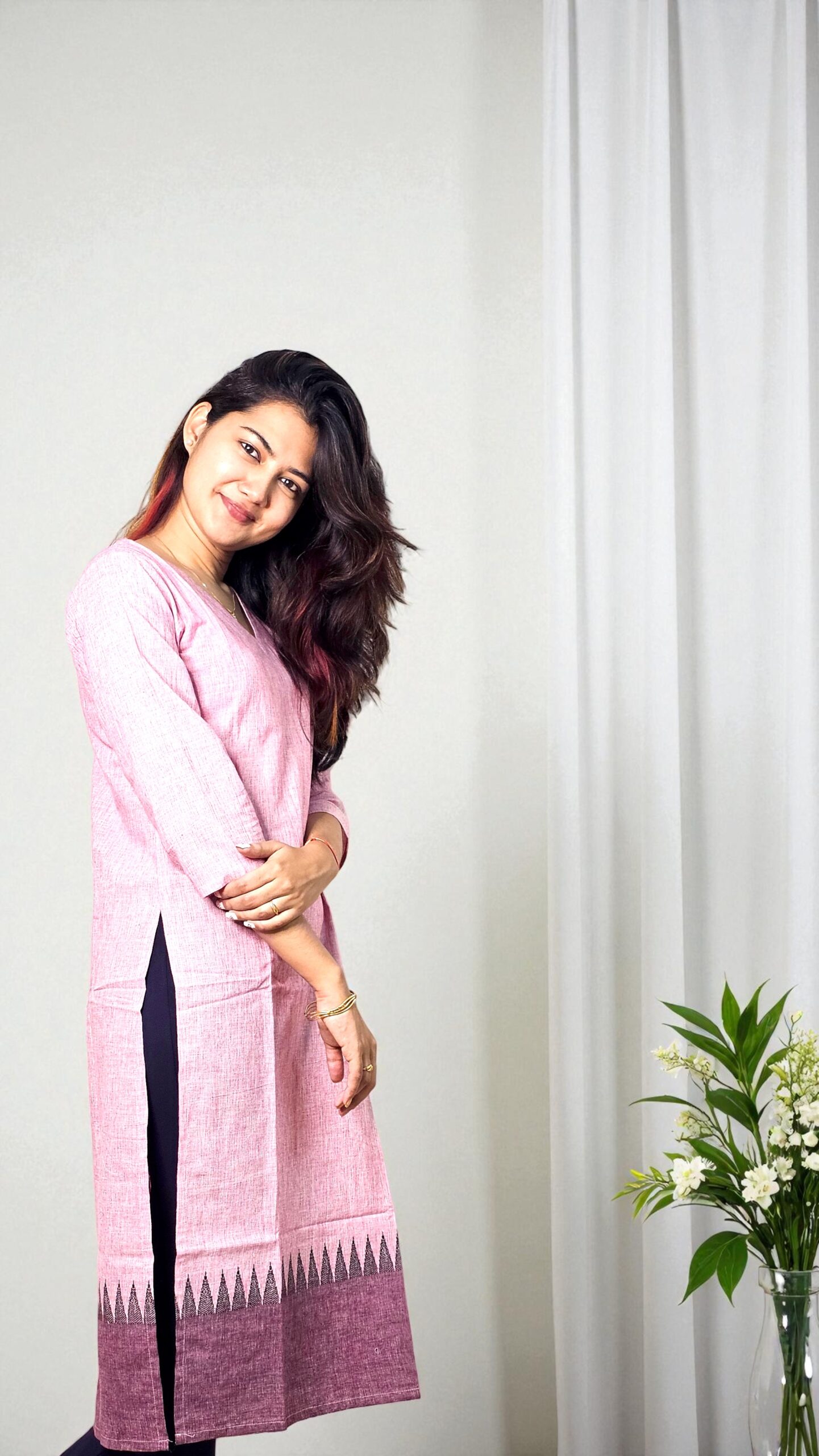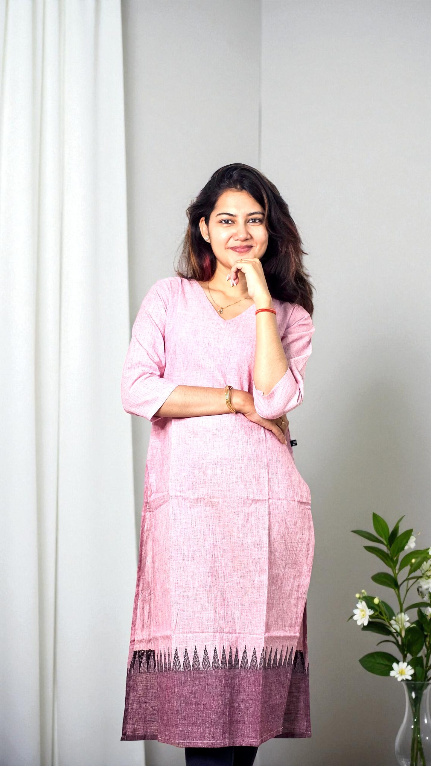 Crafted from breathable Khadi Cotton, Aarvika offers an elegant everyday charm. The soft blush pink hue is paired with a woven border design at the hem, creating a subtle contrast that enhances its handcrafted appeal. Designed with a V-neckline, 3/4th sleeves, and side pockets, it delivers effortless comfort for casual and semi-formal wear.