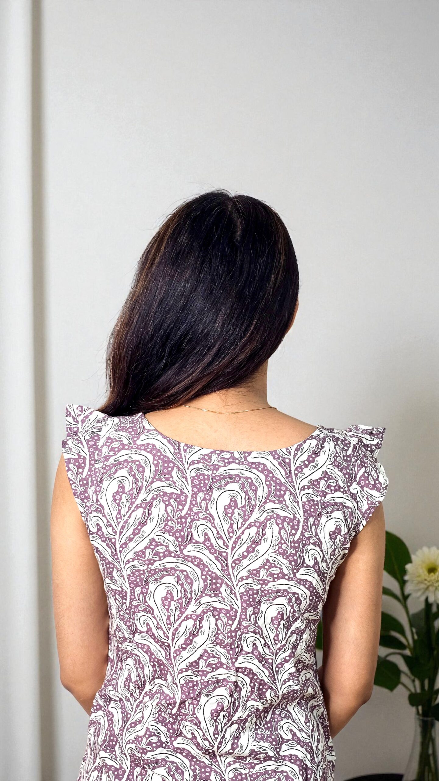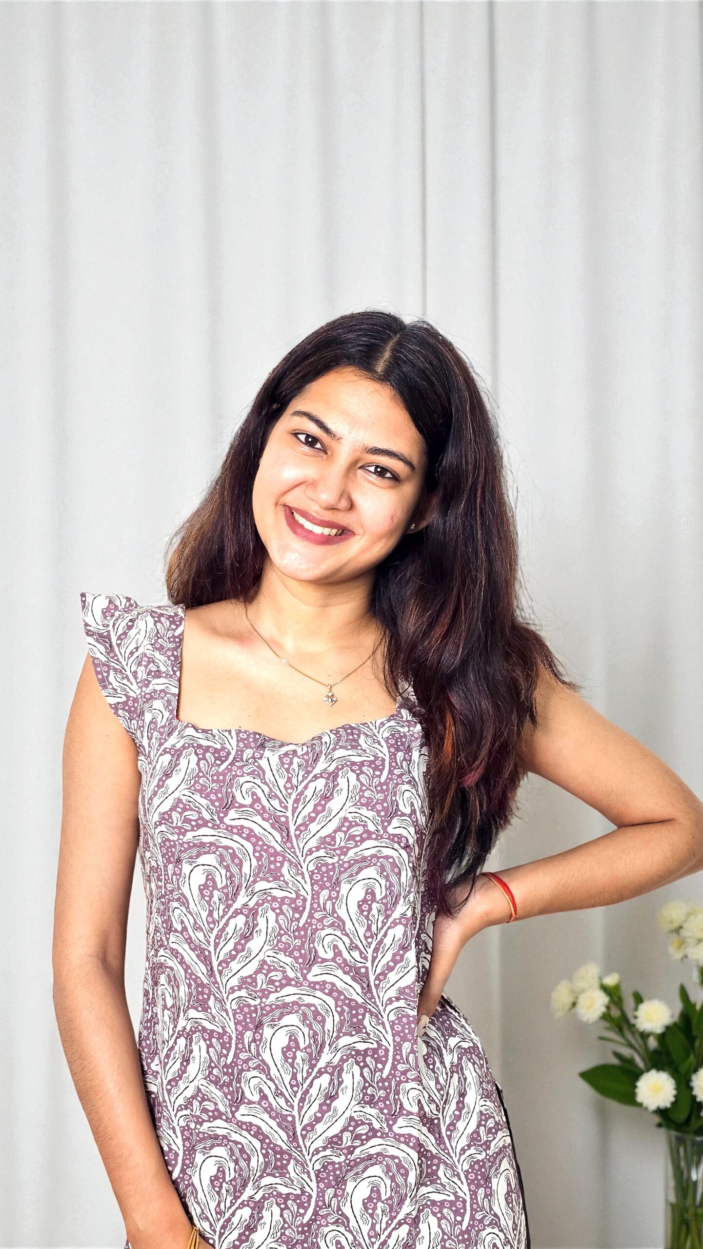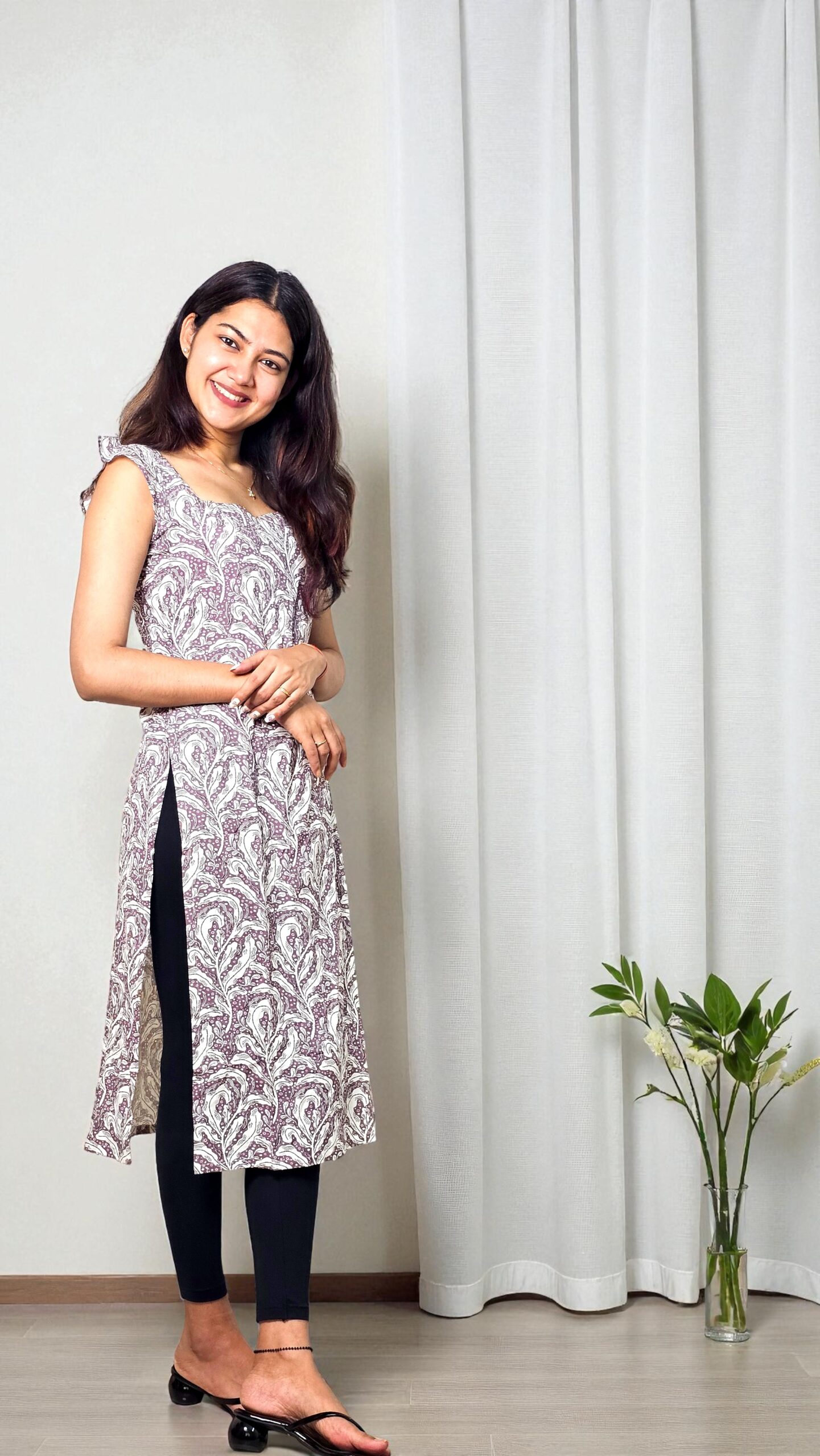 Made from premium Reyon Cotton fabric, Aarvya is designed to blend sophistication with everyday ease. Its elegant mauve floral print adds a soft feminine touch, while the ruffled sleeves and sweetheart neckline bring a subtle contemporary twist to the traditional kurti silhouette. Lightweight and breathable, it’s perfect for casual outings, office wear, or festive brunches.