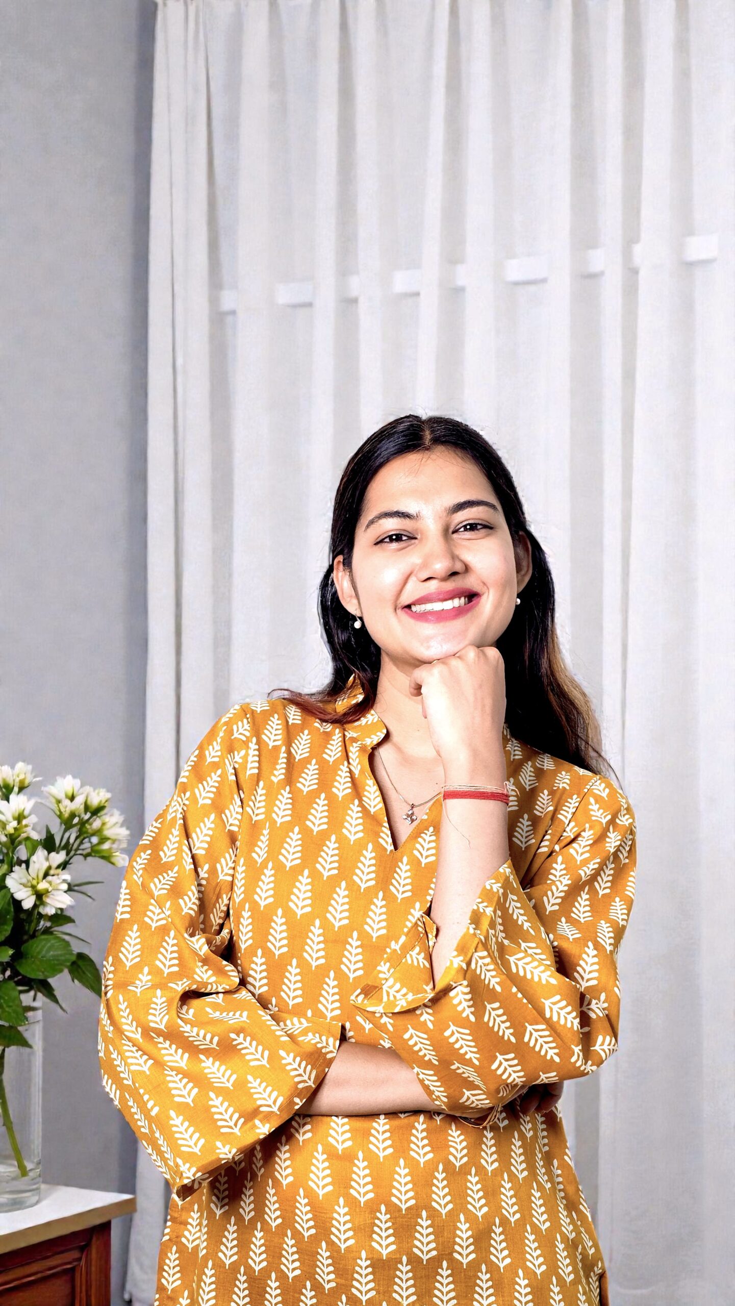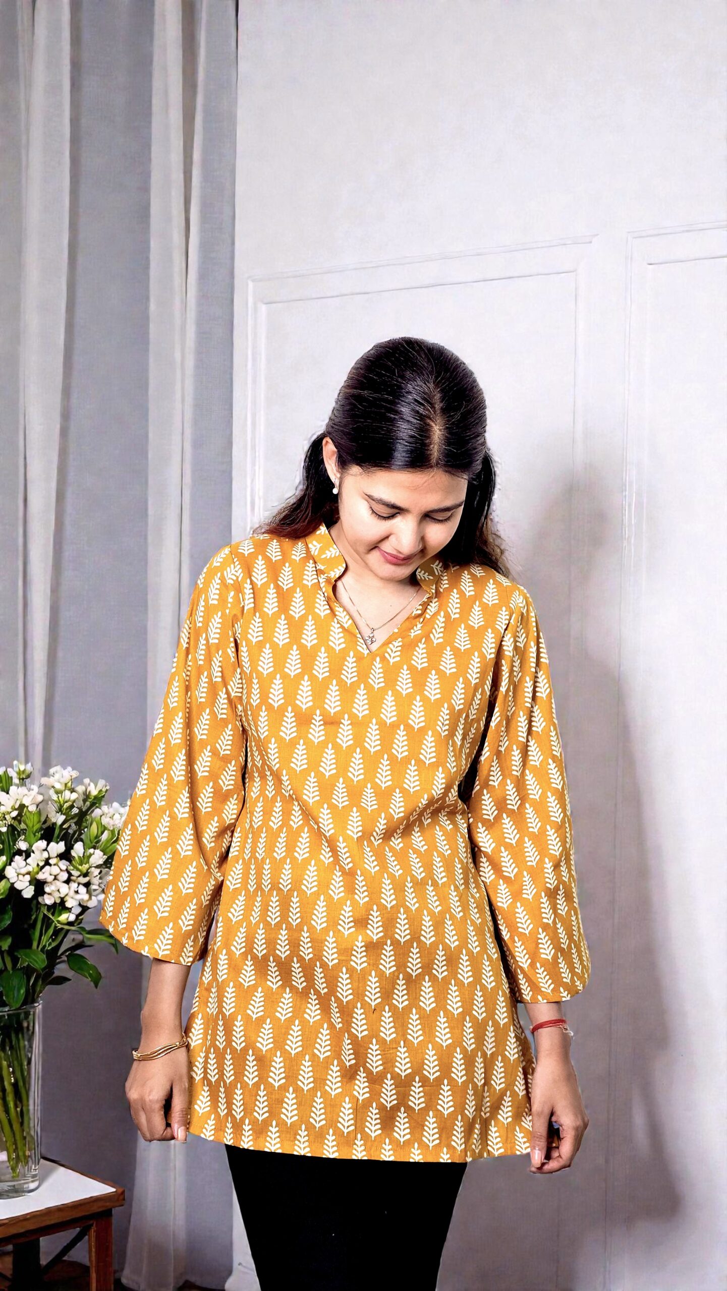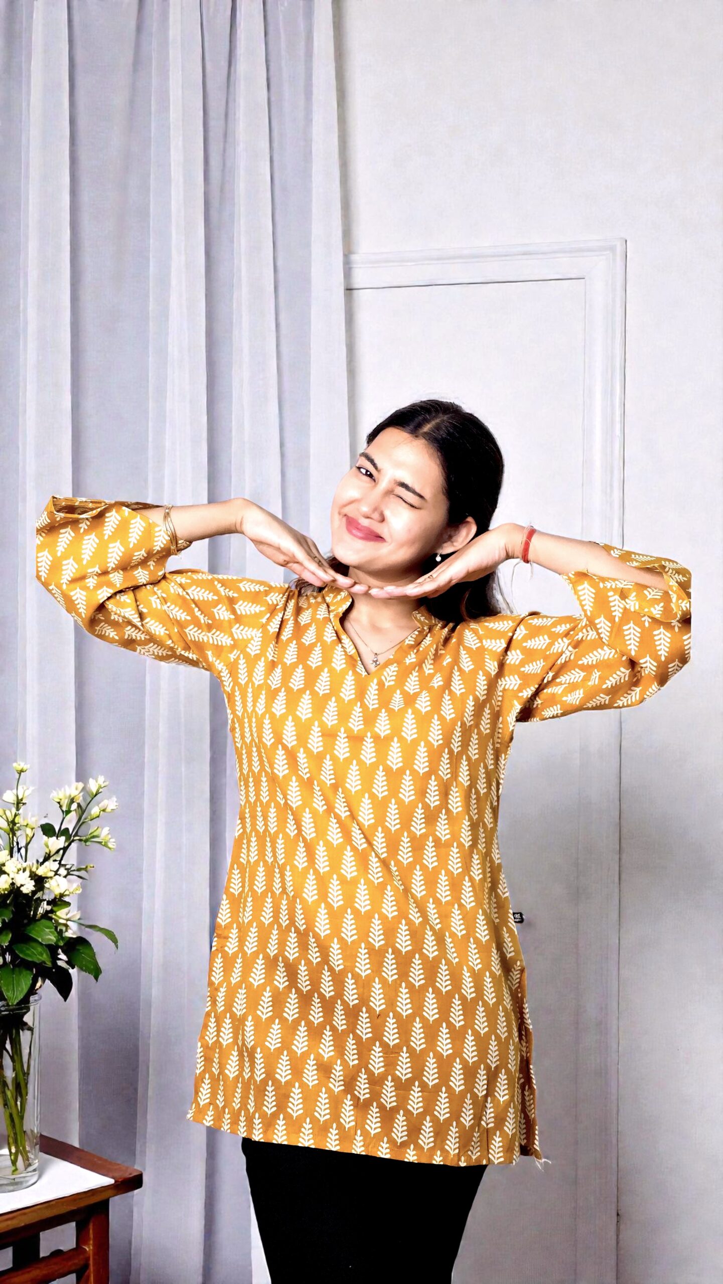 The Elvina – Mustard Wheat Motif Cotton Top is designed for comfort with timeless appeal. Crafted in breathable pure cotton, this top features a rich mustard base highlighted with neat wheat-inspired block motifs, creating a look that is simple yet refined.