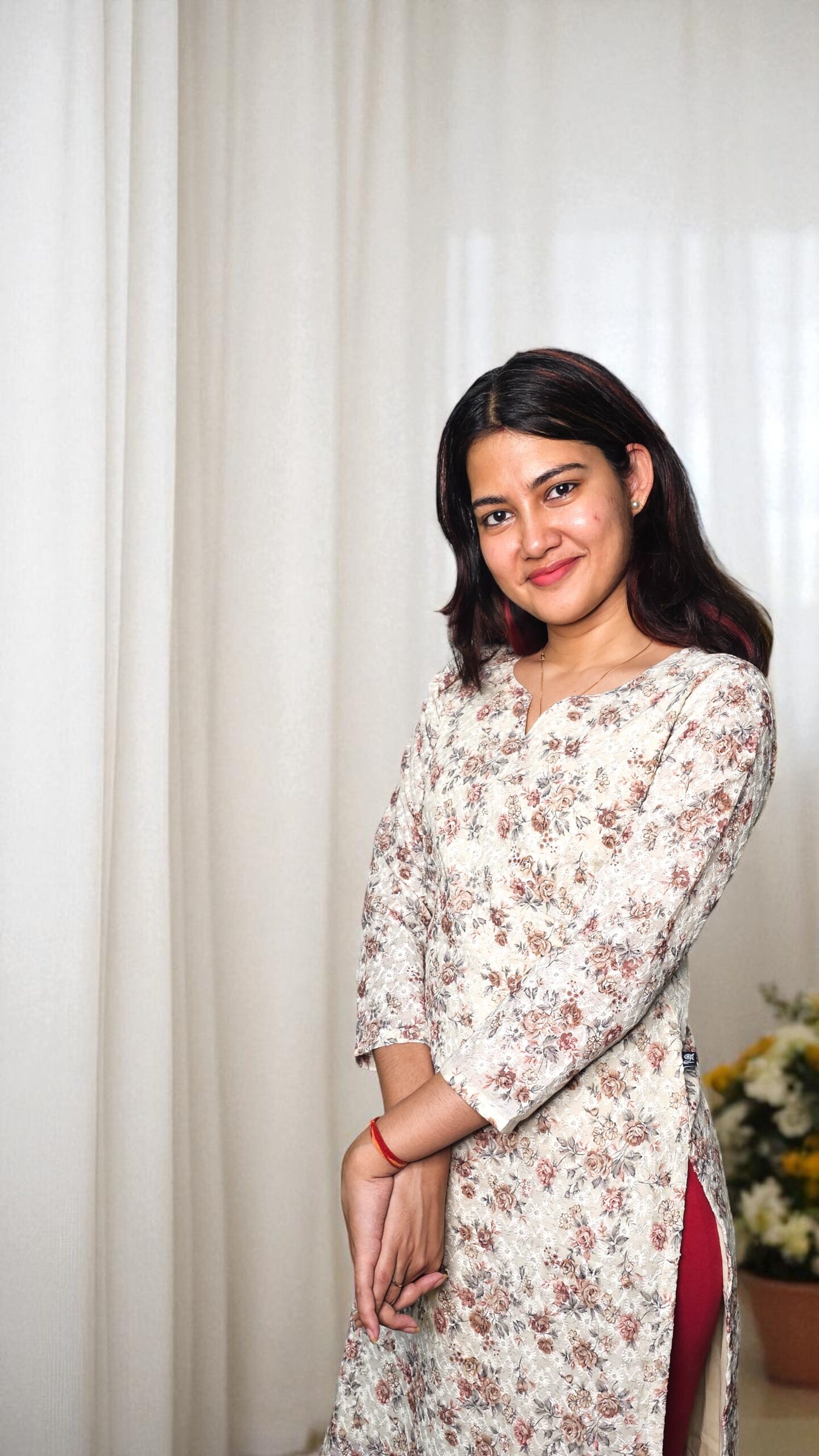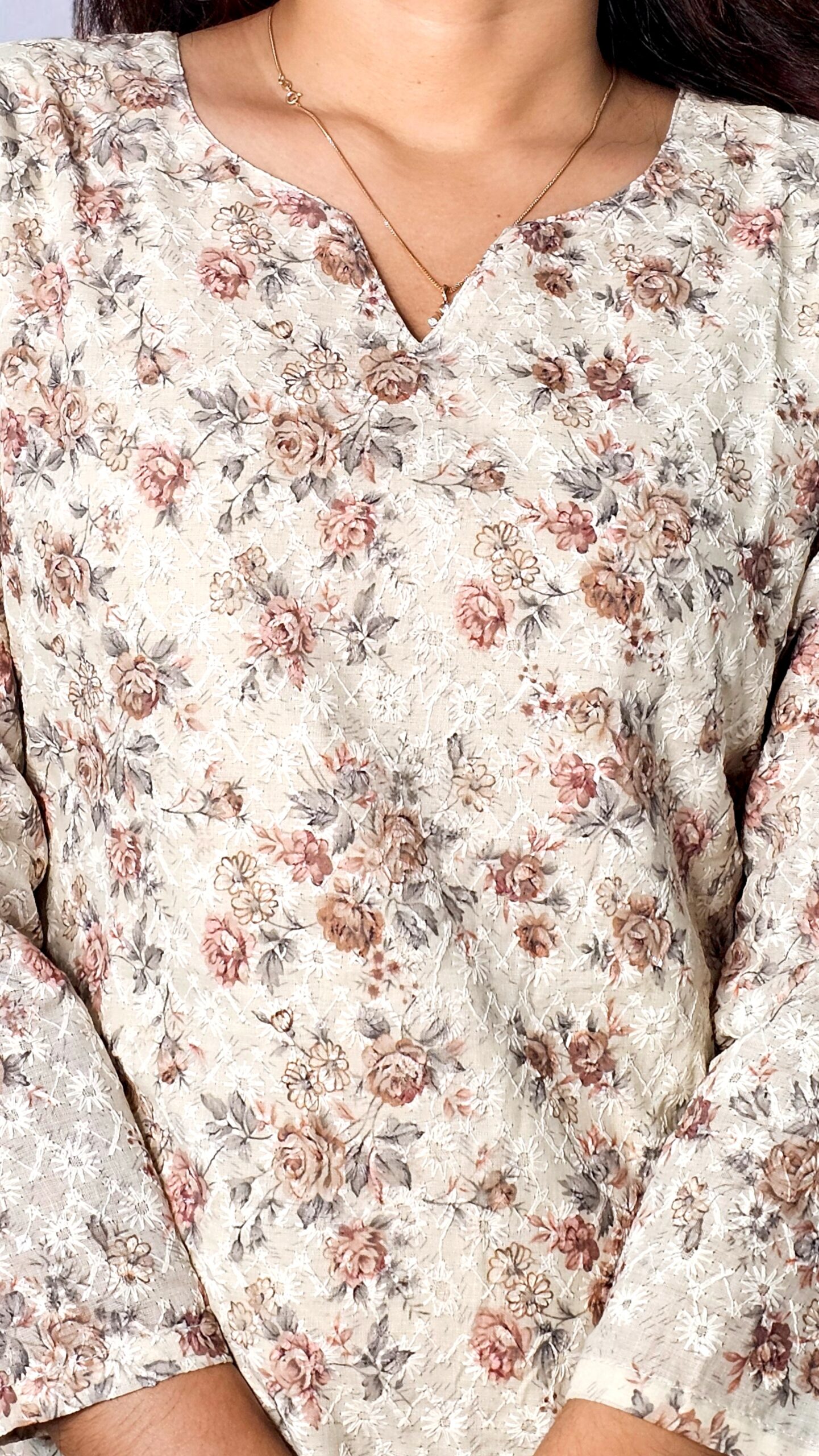 Delicate and graceful, the Elvira – Cream Floral Embroidered Kurti embodies subtle sophistication. The soft cream base is adorned with fine floral prints in shades of blush and taupe, complemented by thread-textured embroidery that adds gentle richness. Designed with a notched neckline, 3/4th sleeves, and straight-cut silhouette, this kurti is perfect for everyday elegance or semi-formal occasions. Pair it with rust, beige, or maroon leggings for an effortlessly refined look.