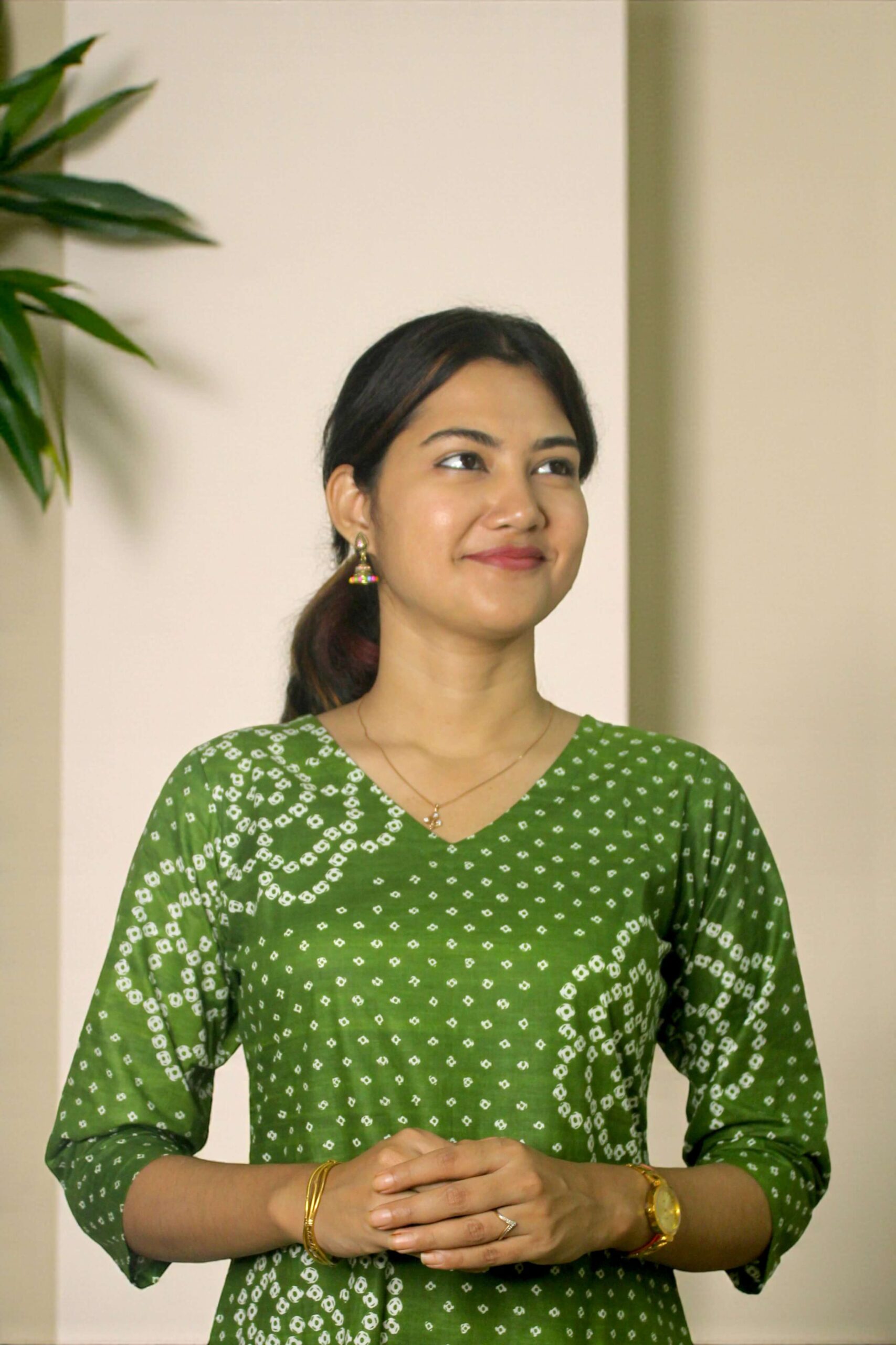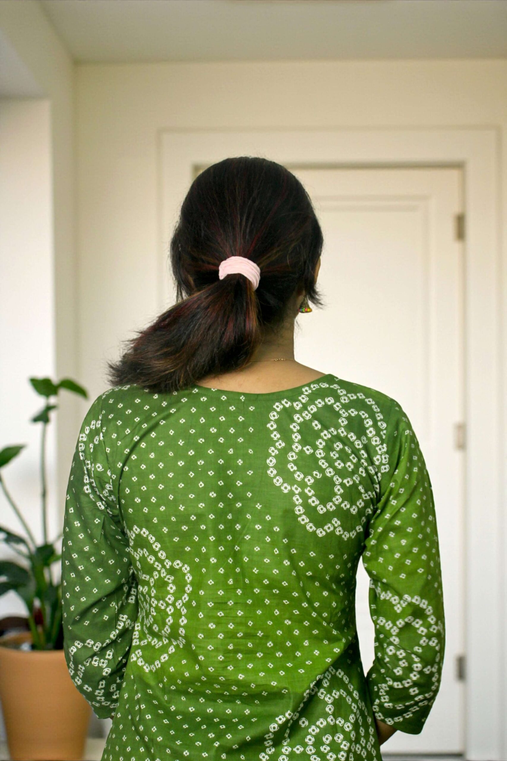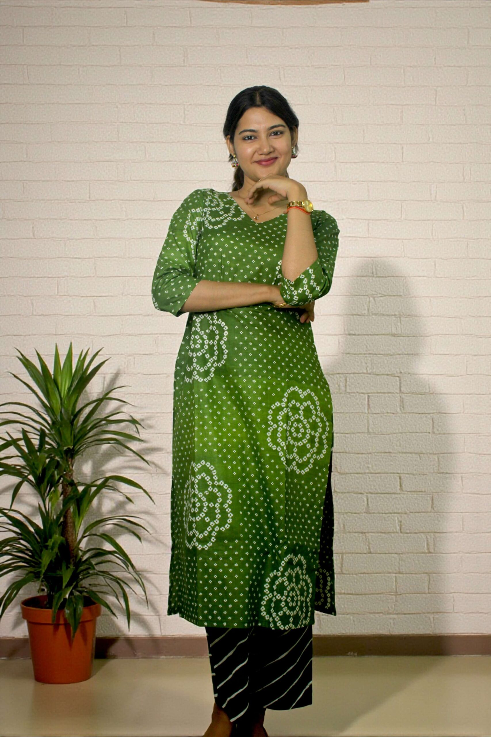 Step into elegance with the Emerald Aura Coord Set, a perfect blend of comfort and tradition. The kurta in a rich emerald green tone is adorned with delicate bandhani-style dots and bold circular motifs, bringing an ethnic yet modern flair. Paired with contrasting black striped pants, this set is versatile enough for office wear, casual outings, or festive gatherings. Pair it with silver jhumkas and flats for a traditional vibe, or opt for block heels for a chic contemporary twist.