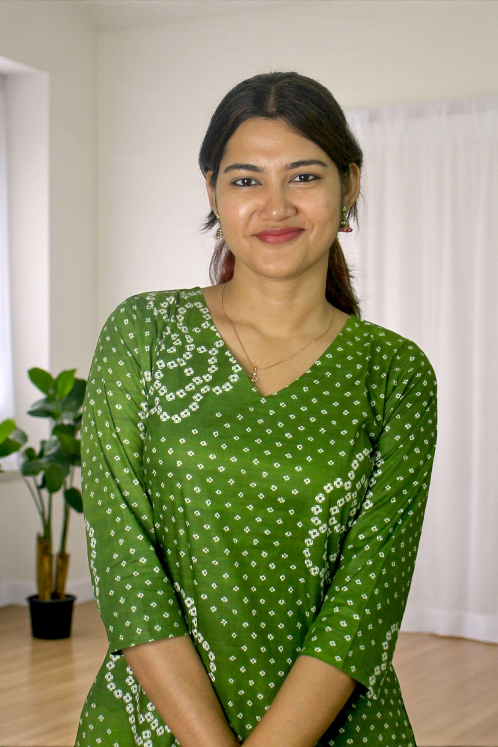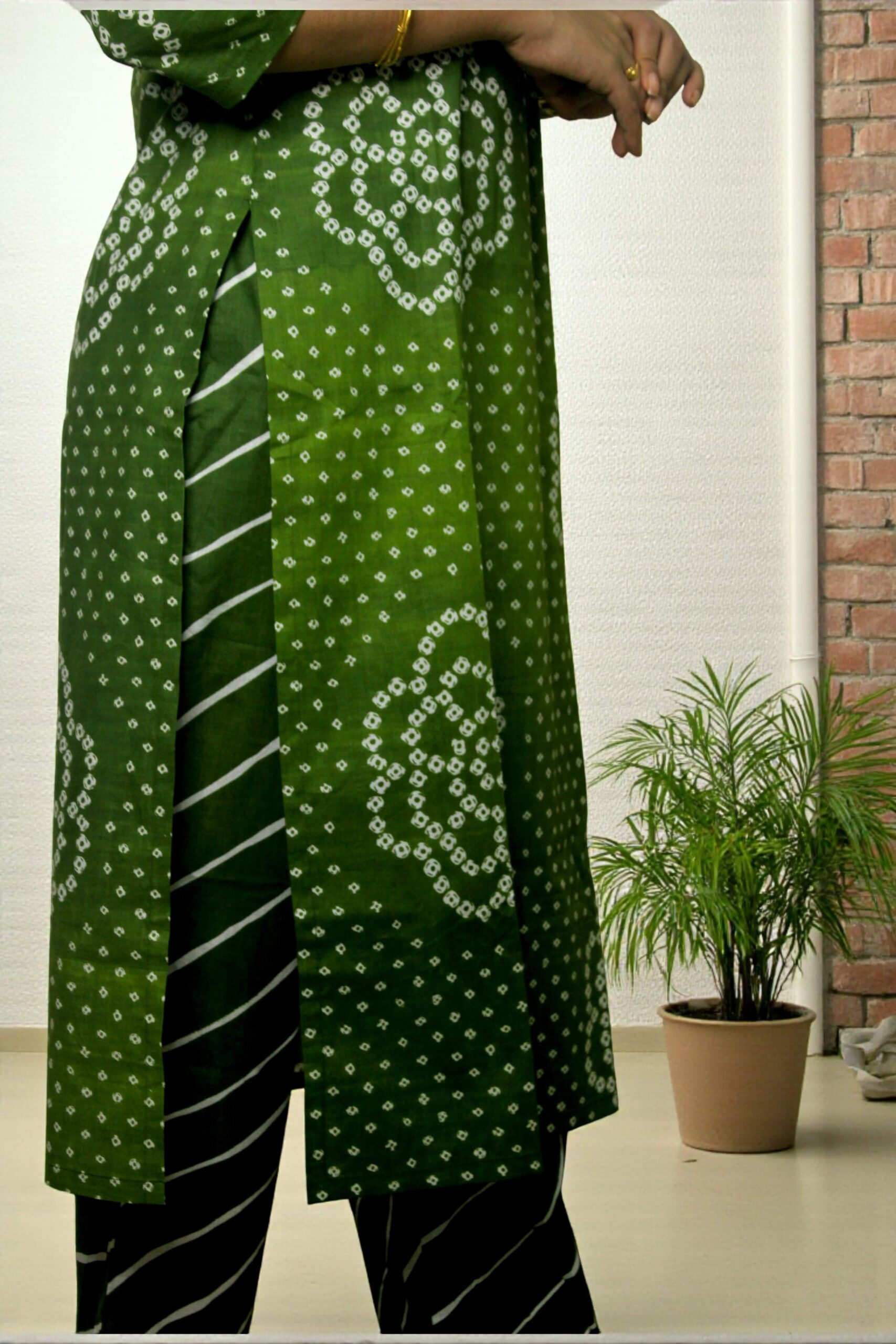 Emerald green coord set with bandhani-inspired prints and striped black pants—traditional with a modern edge.