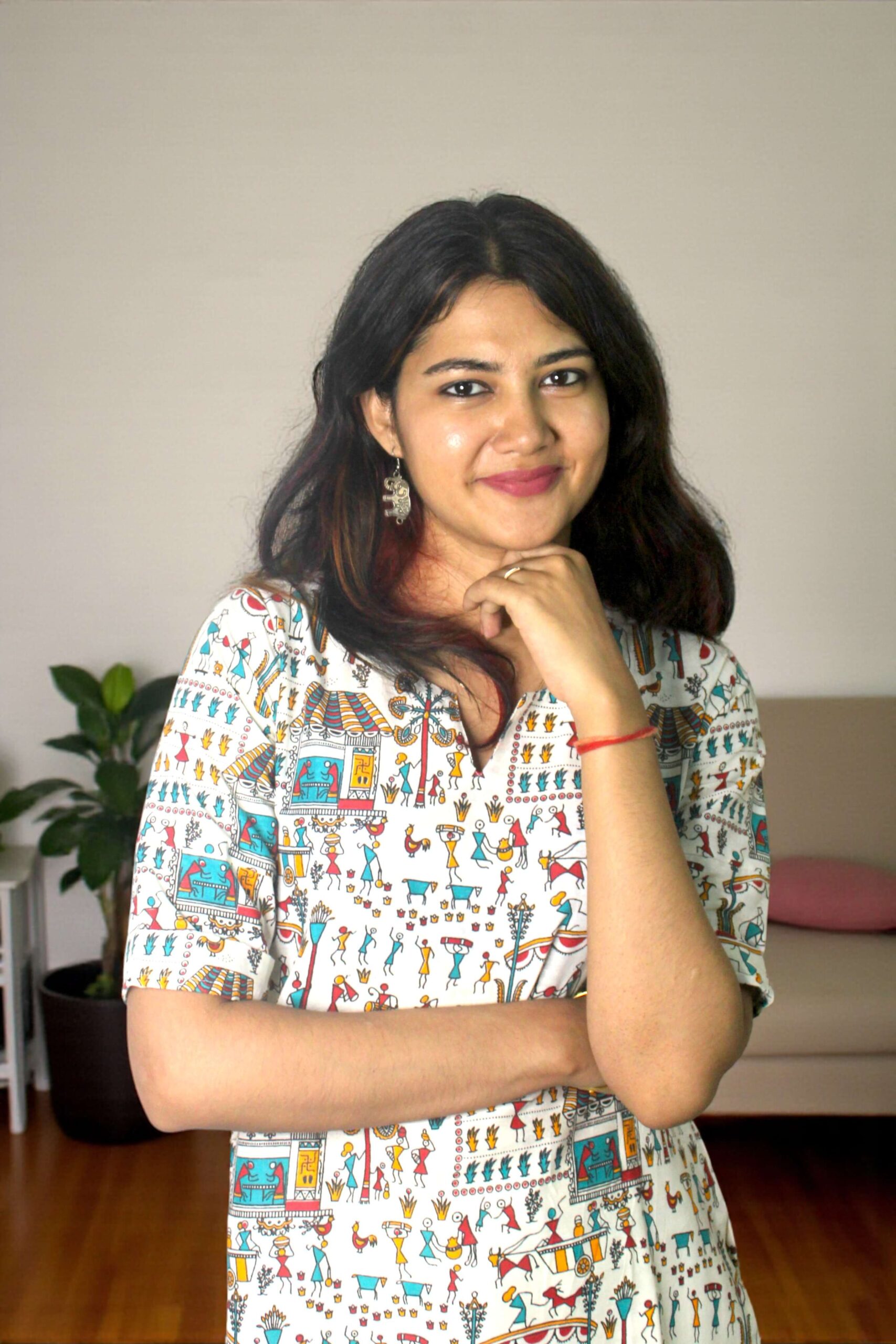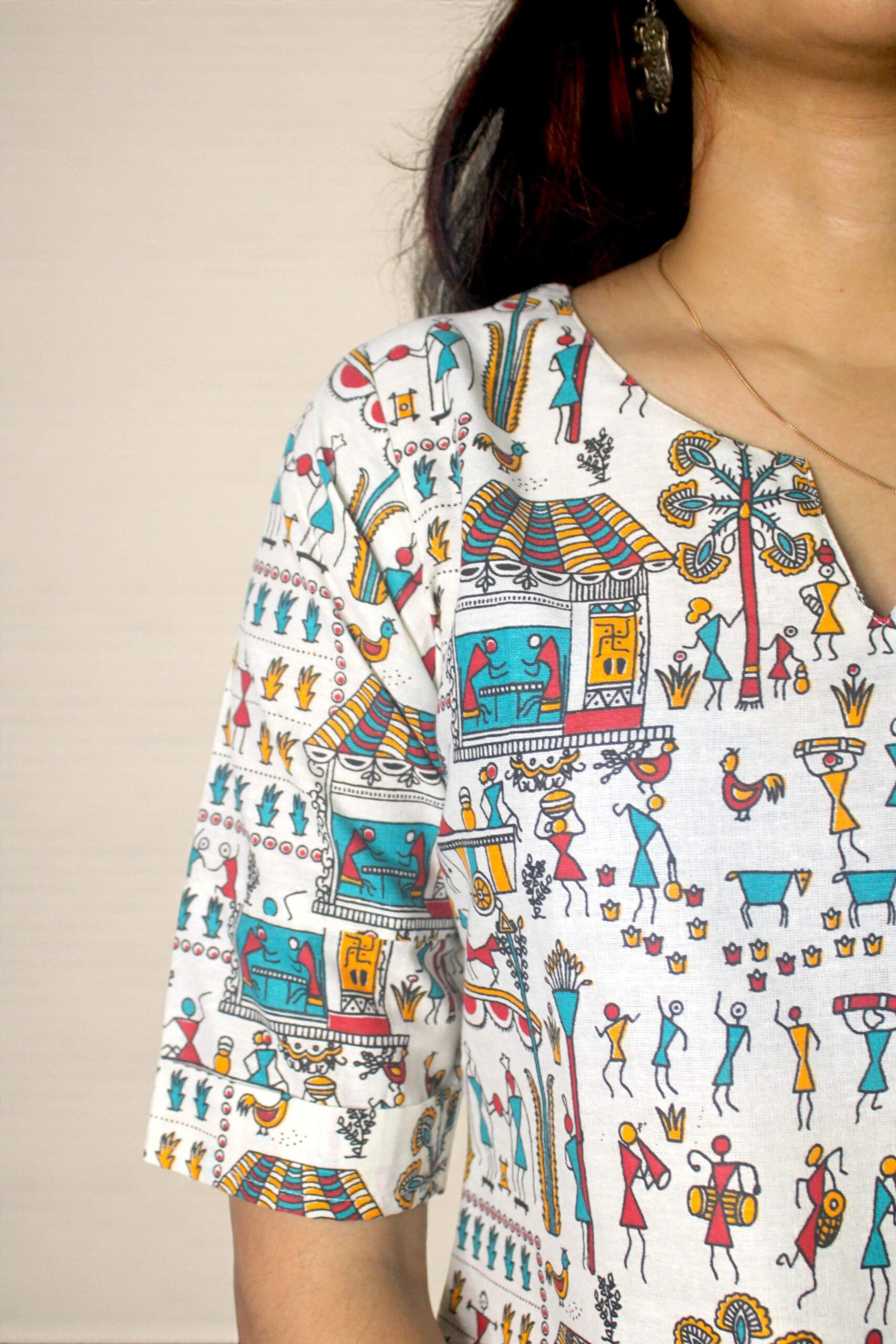 A white kurta top featuring vibrant village-life motifs and a blue ethnic border, celebrating tradition with modern ease.
