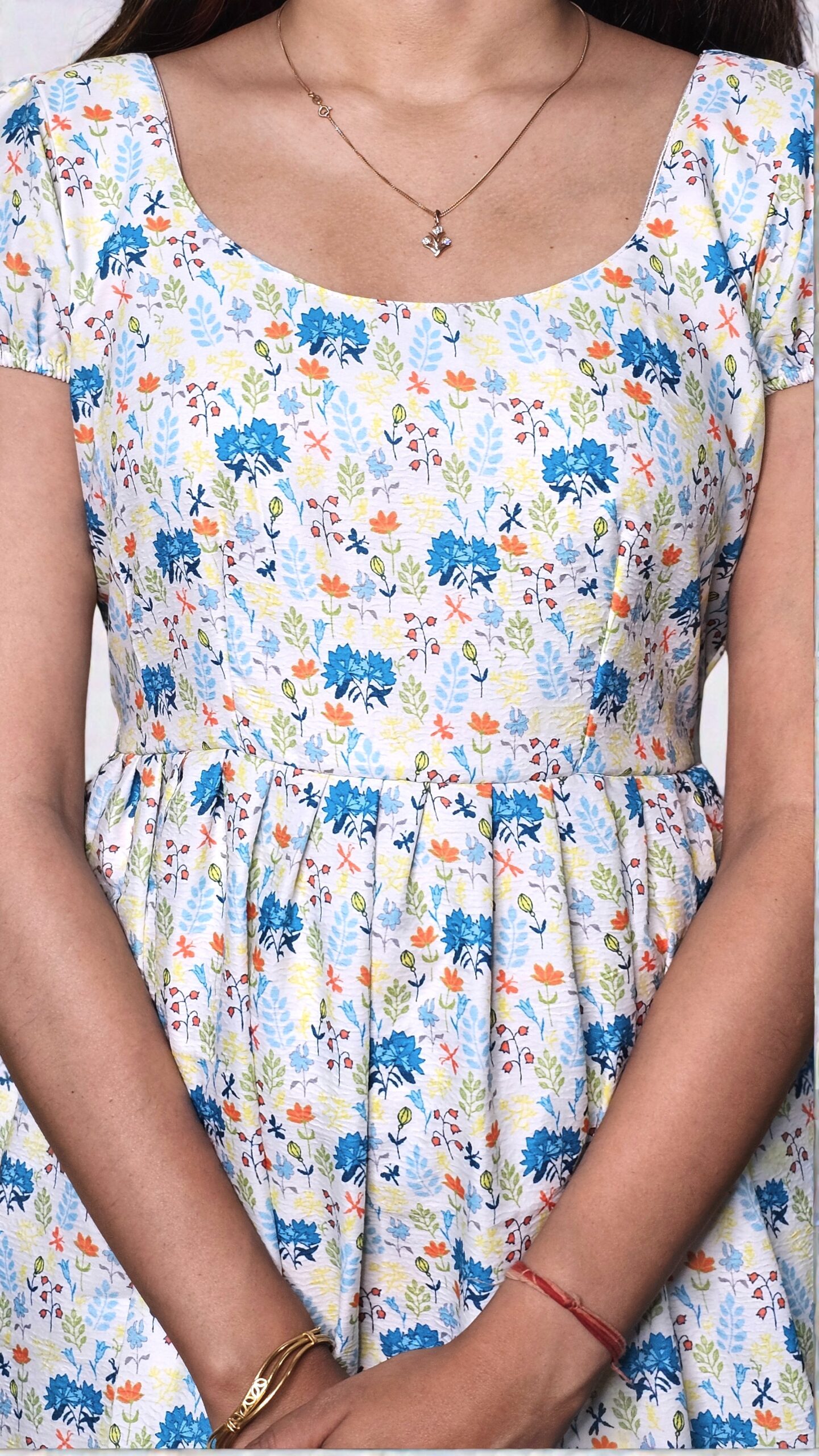 The Liraya – Soft Floral Crepe Dress is designed for comfort with a touch of elegance. Crafted in lightweight crepe fabric, this dress features a soothing base adorned with dainty multicolour floral prints, creating a fresh and graceful look.