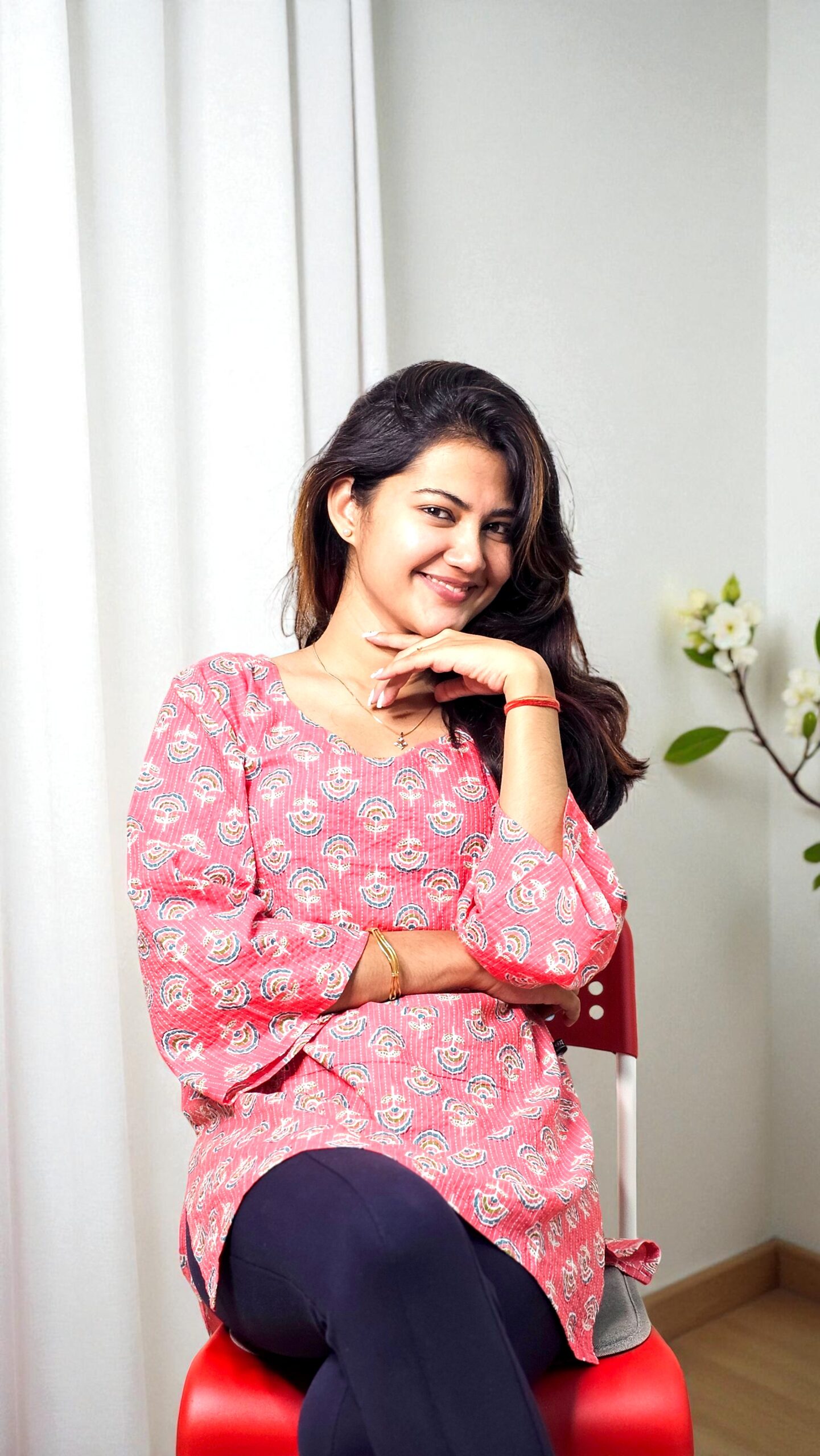 The Niraya Katha Cotton Top brings together comfort and vibrant elegance. Crafted from pure Katha cotton, this soft-textured top showcases playful rainbow block prints that add a cheerful touch to your wardrobe. The flared sleeves and side slits ensure an easy fit and free movement, making it ideal for both casual outings and work wear. Pair it with your favorite bottoms to create a look that’s both effortless and radiant.