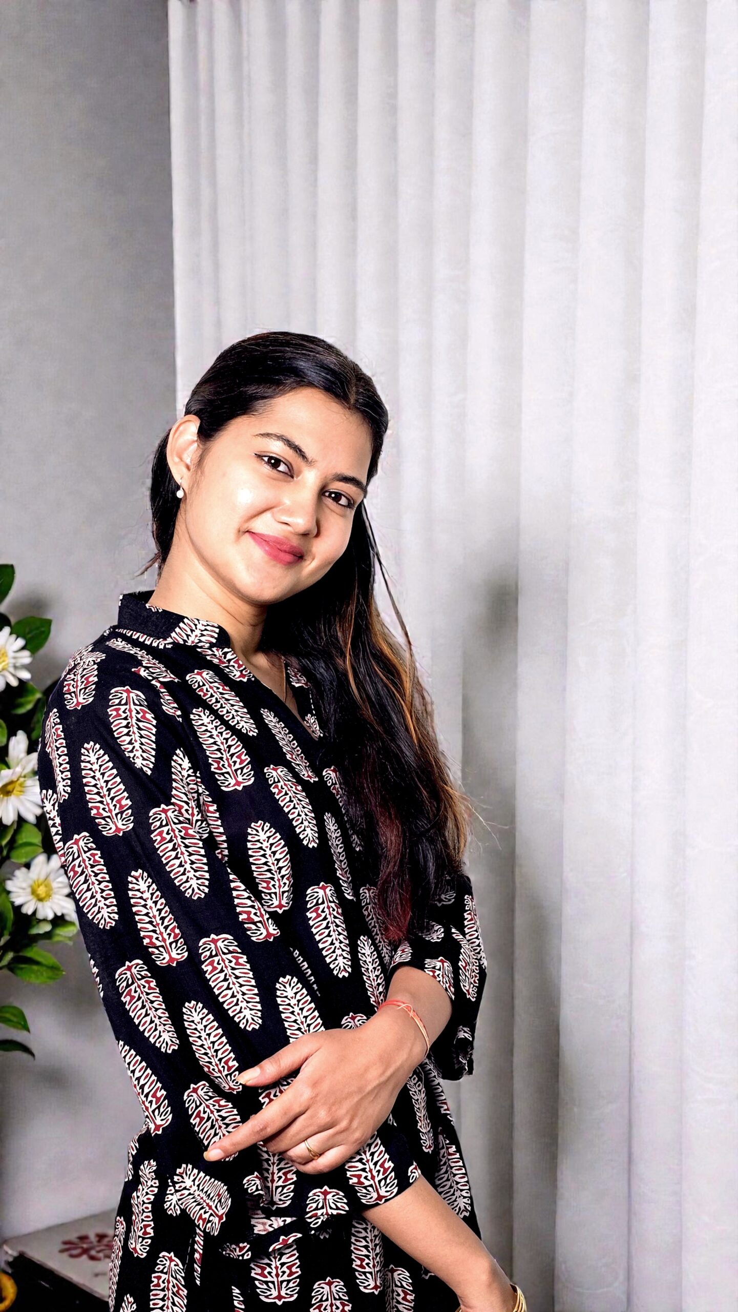 The Nyra – Black Leaf Motif Cotton Top is designed for women who love timeless prints with everyday comfort. Crafted in breathable pure cotton, this top features a deep black base highlighted with subtle leaf motifs in earthy tones, creating a refined yet versatile look.
