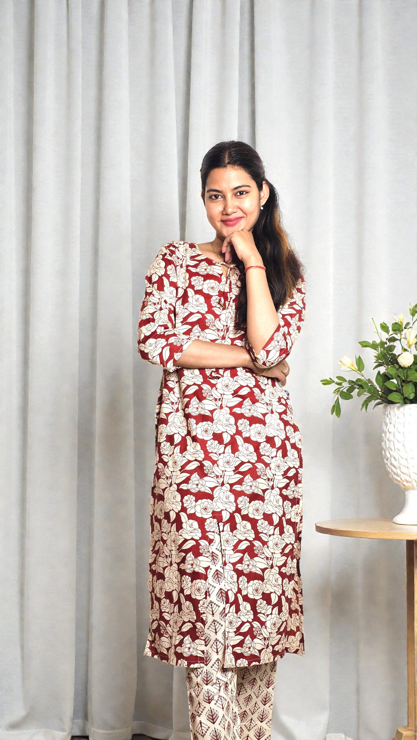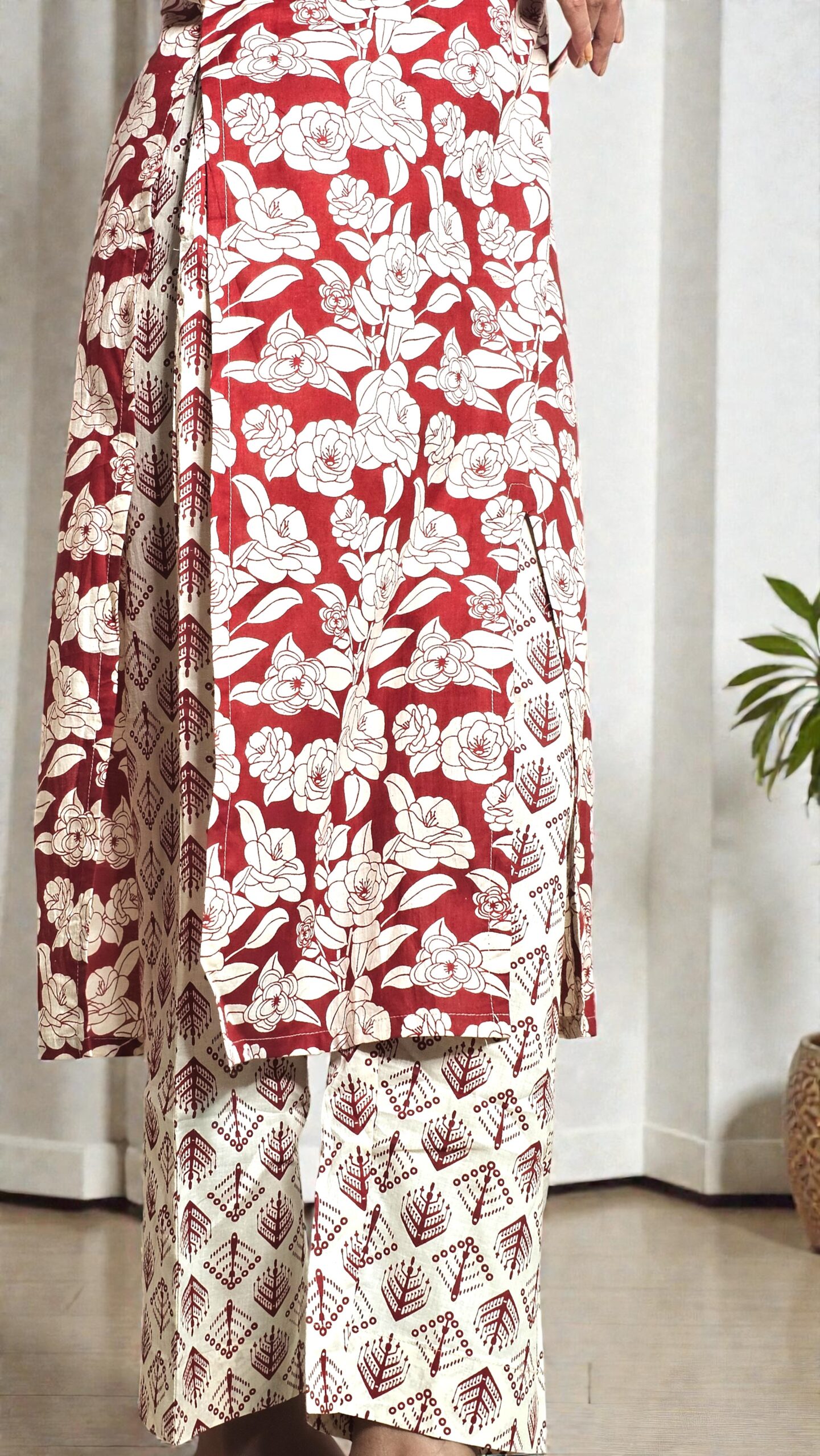 A classic wine-red floral co-ord set crafted in premium cotton, featuring a straight-cut kurta with soft floral prints and coordinated printed pants for effortless everyday elegance.