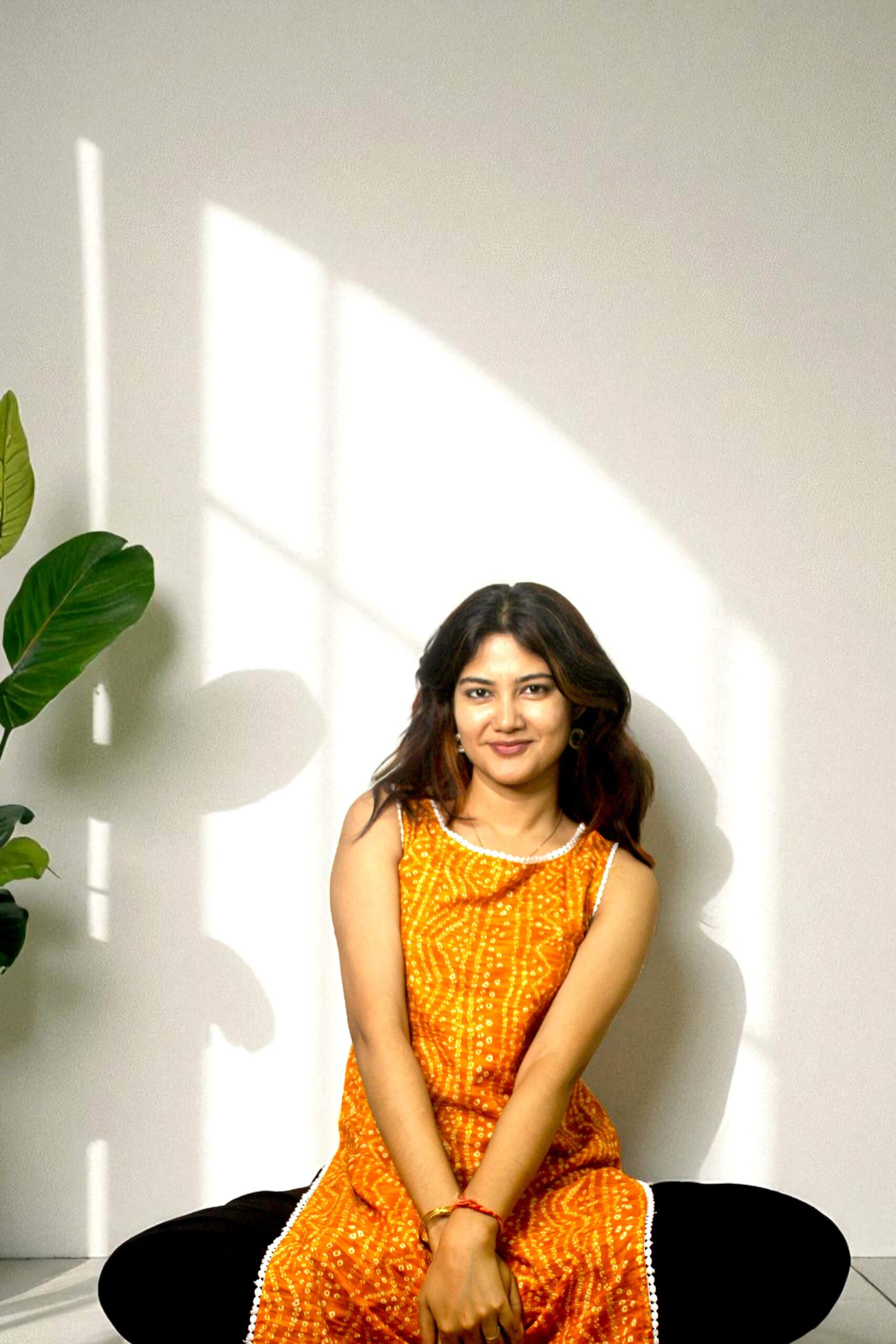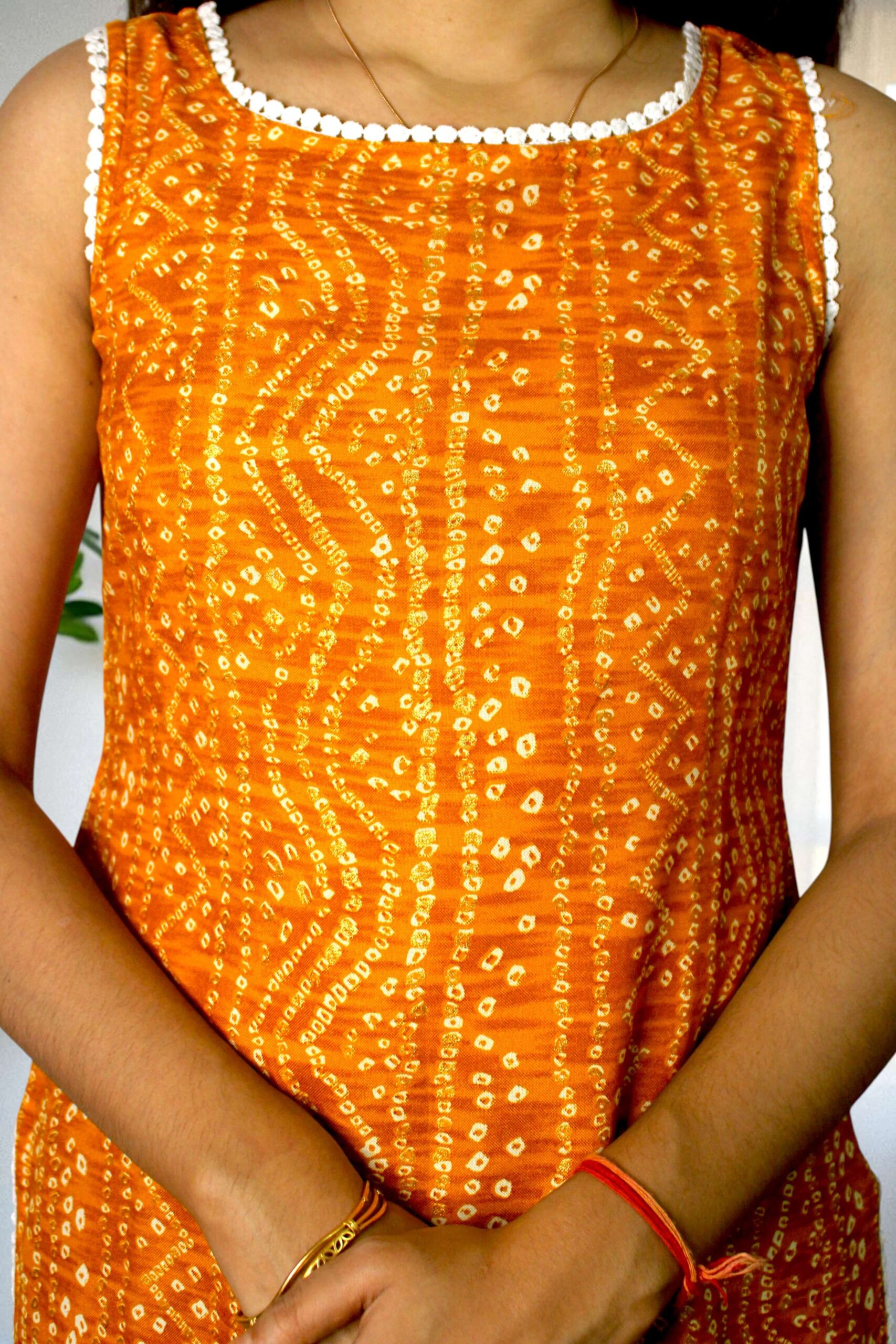 A vibrant orange long kurta with white bandhani-style patterns, sleeveless design, and lace-edged details.