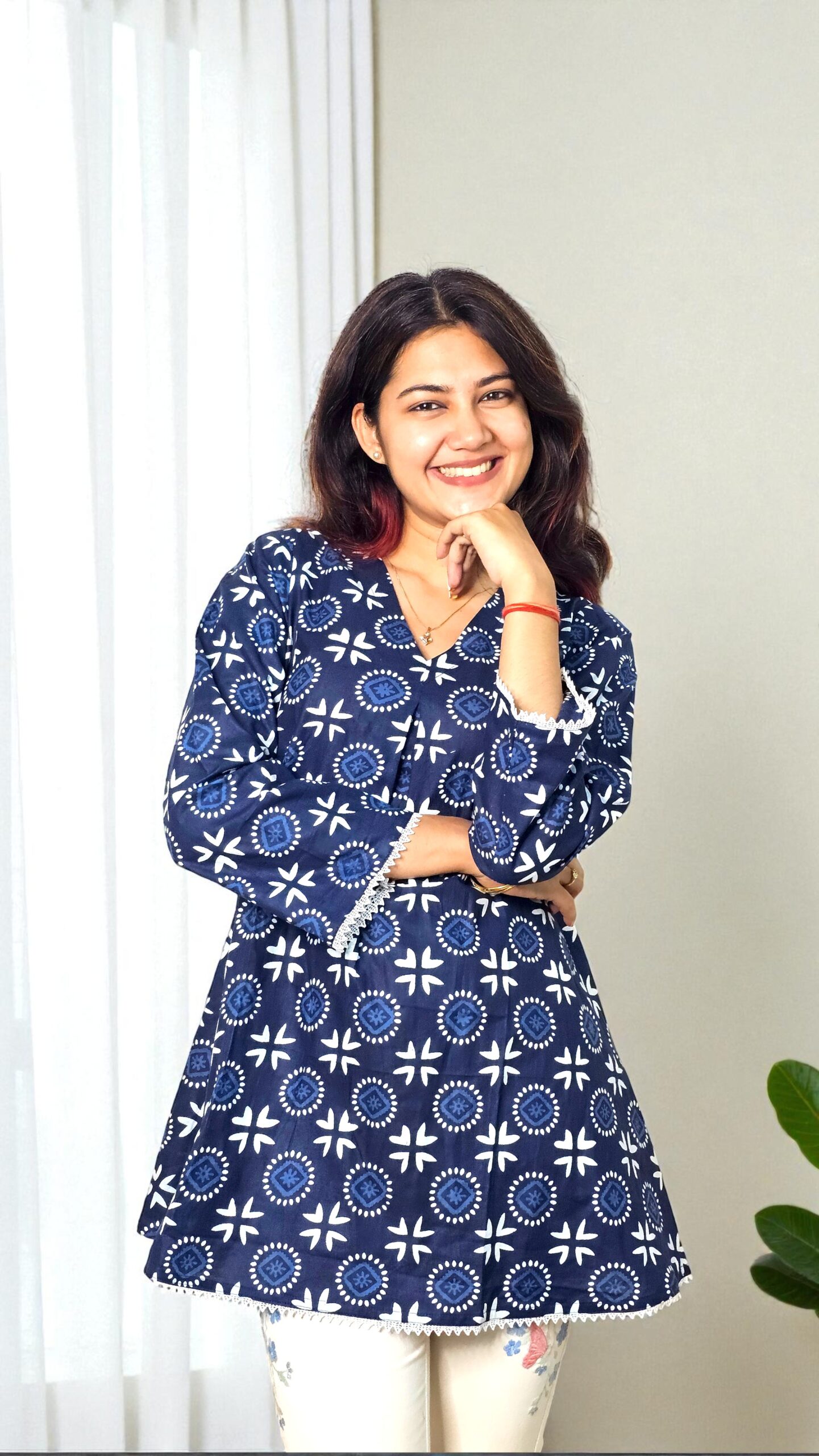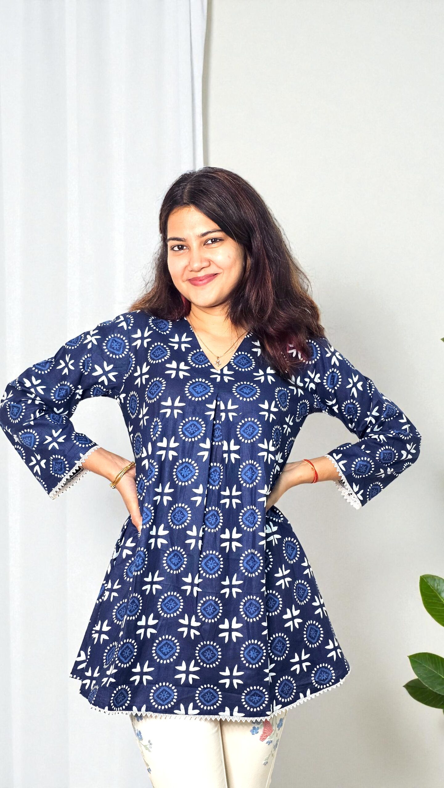 Introducing Saiyaara, a beautifully tailored kurta top made from high-quality premium cotton, designed to offer a breezy yet refined look. The indigo hand-block-style print adds a touch of artistry, while the subtle lace edging enhances its feminine charm. With a relaxed fit and soft fabric feel, Saiyaara transitions seamlessly from workwear to weekend outings. Pair it with trousers, denims, or palazzos for an effortlessly chic ensemble.