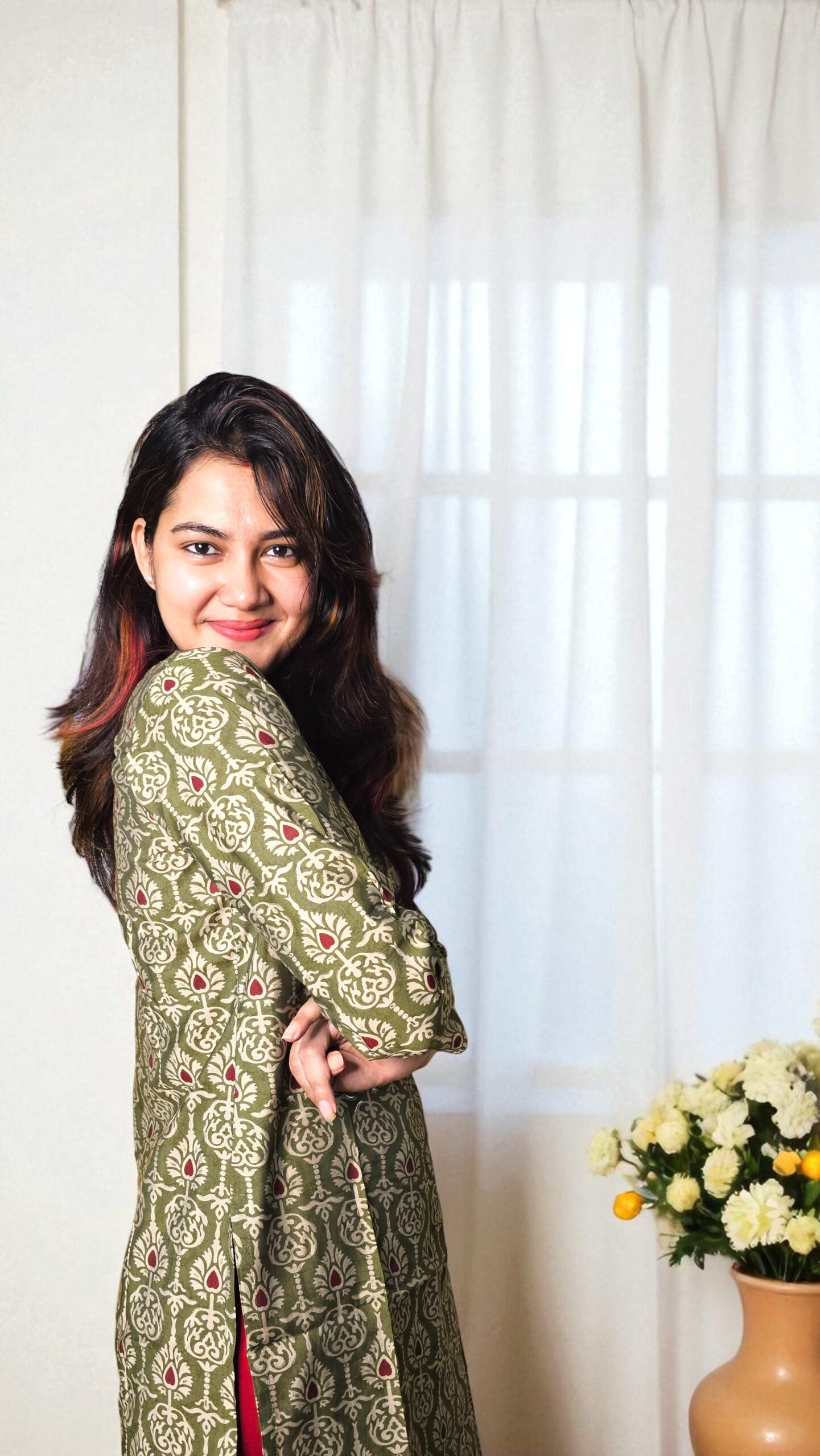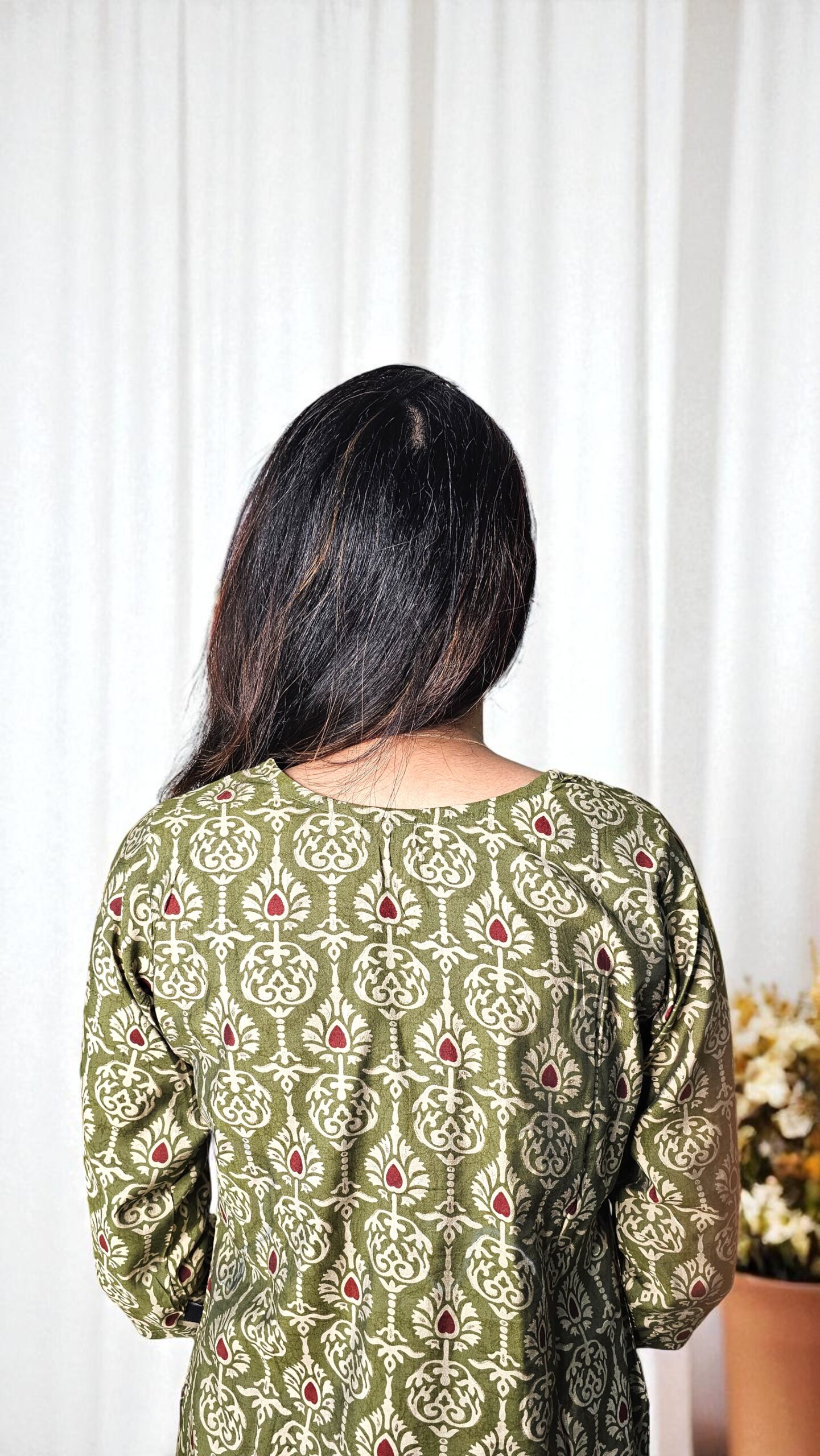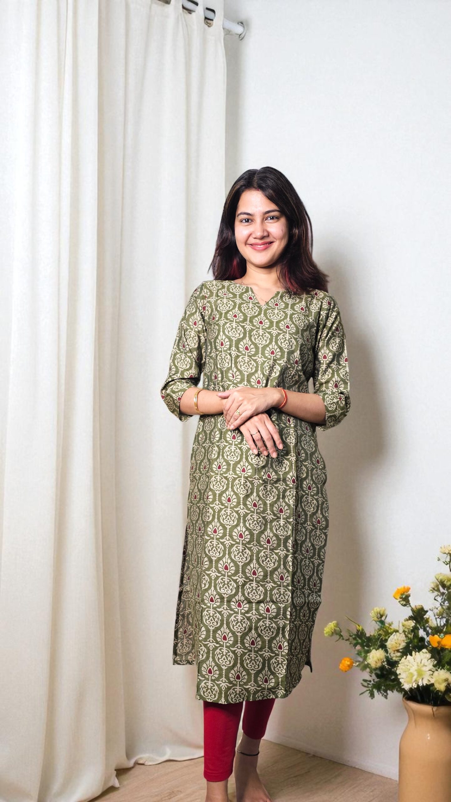 An olive green kurti with traditional block floral motifs and maroon highlights — elegant, minimal, and versatile.