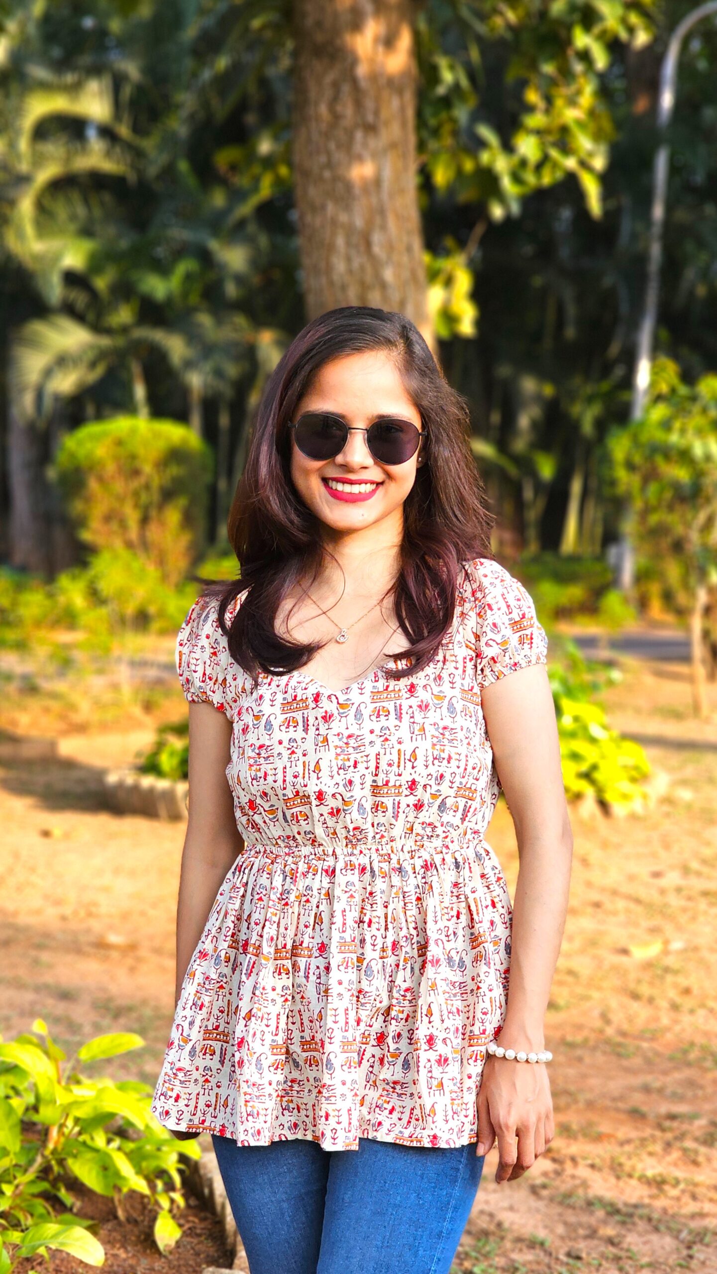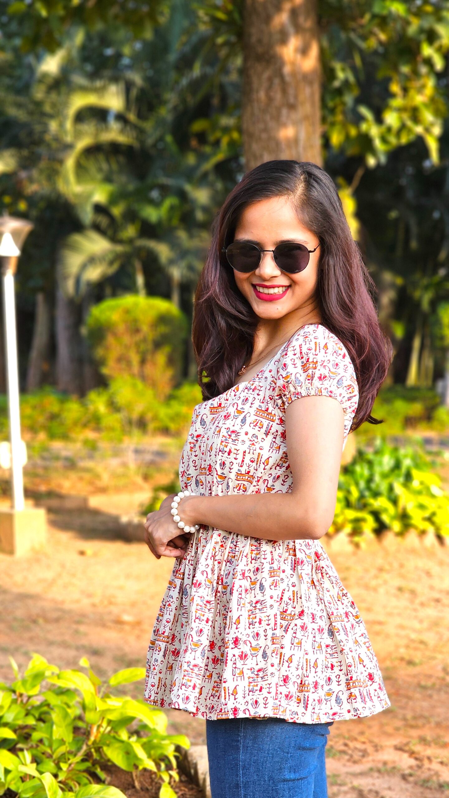A soft and playful peplum top featuring hand-inspired tribal motifs, puff sleeves, and a flattering gathered waist — perfect for effortless everyday styling.