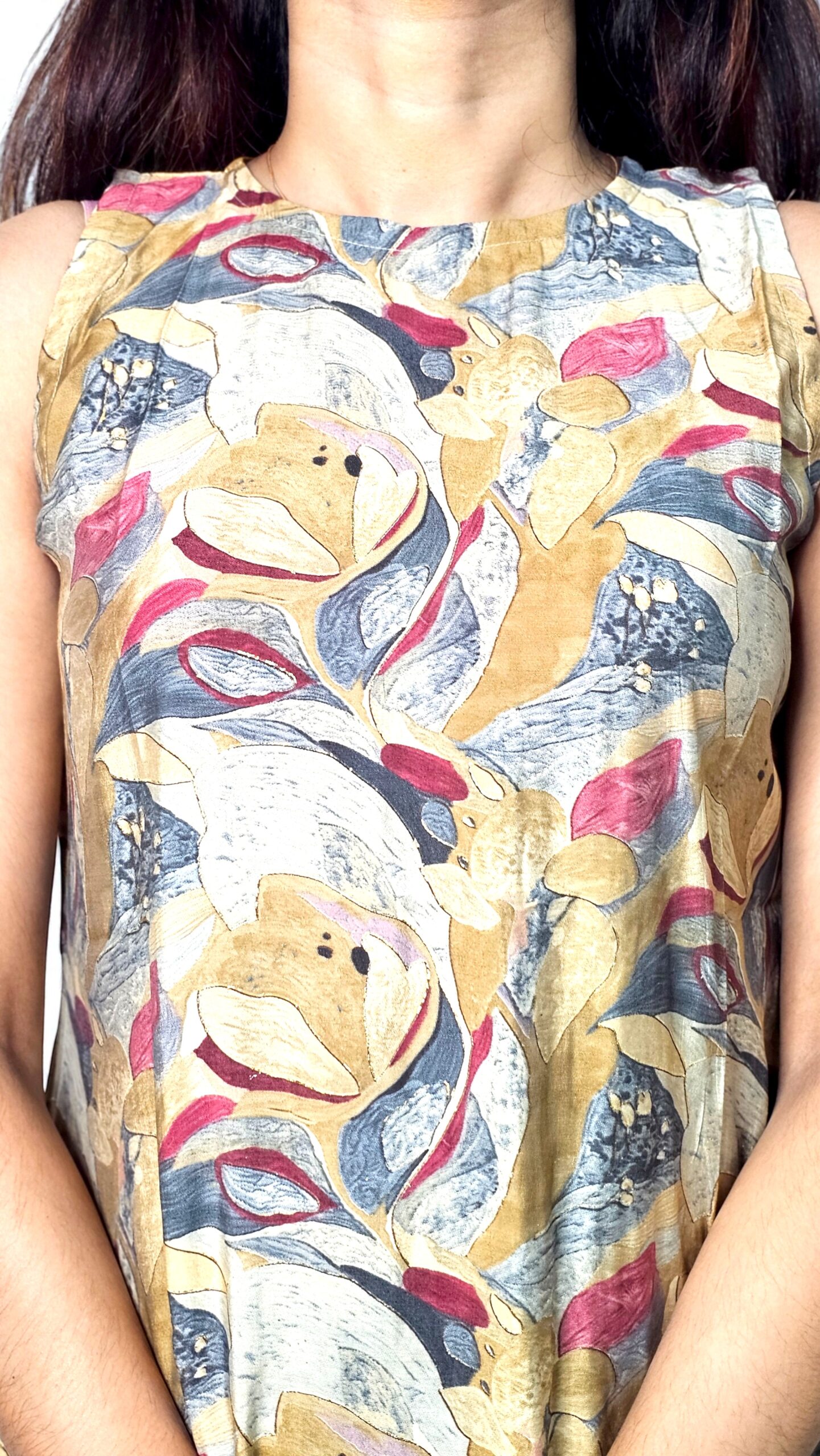 Crafted from premium Chanderi fabric, Tavira celebrates Indian artistry through its exquisite golden leaf foil print and contemporary sleeveless silhouette. The fabric’s natural sheen gives it a festive touch, while the lightweight texture ensures all-day comfort. Perfect for both casual gatherings and special occasions, this kurti effortlessly transitions from daywear to evening elegance.
