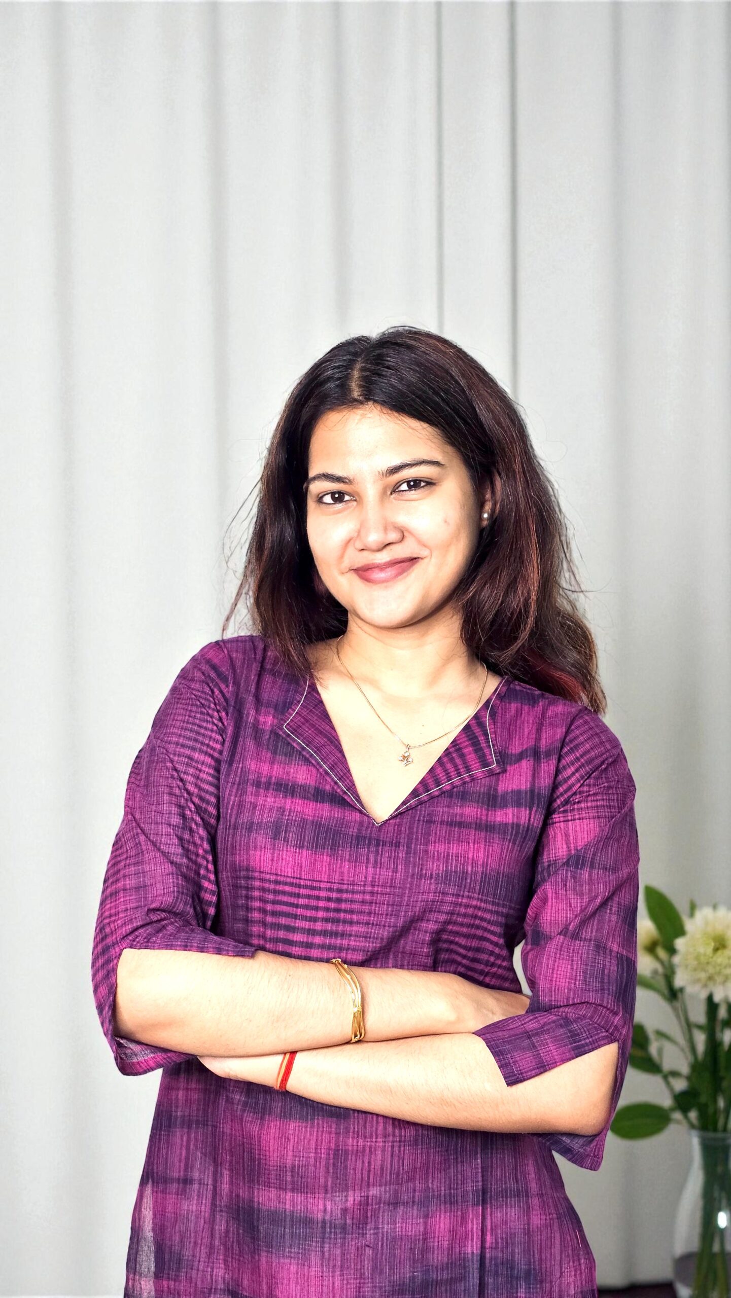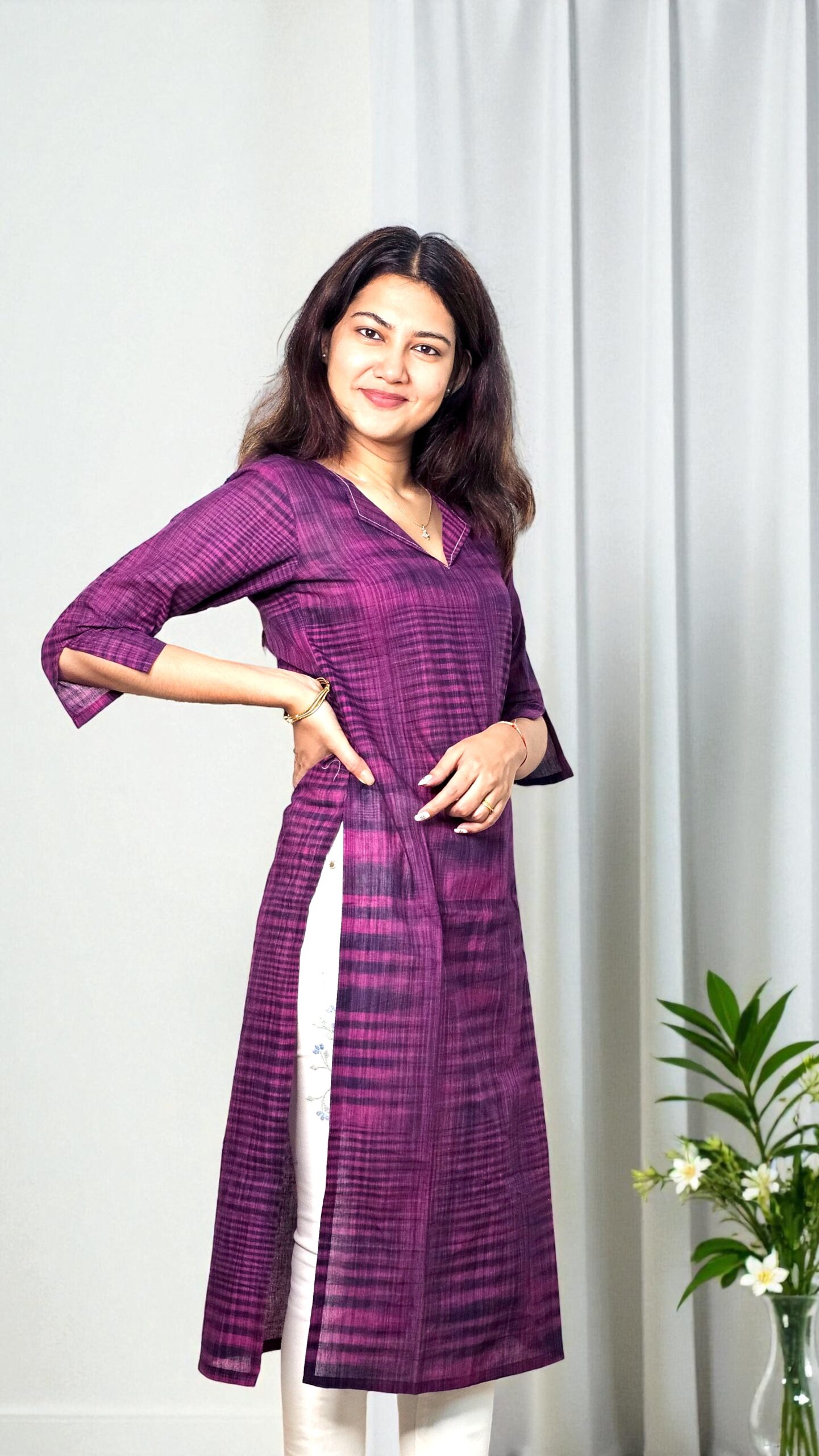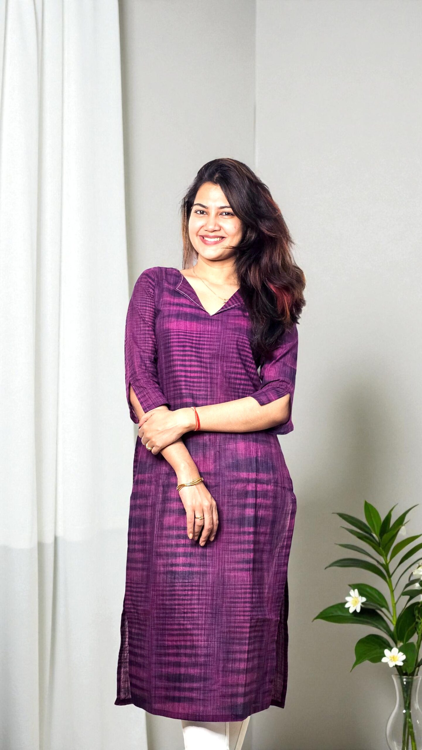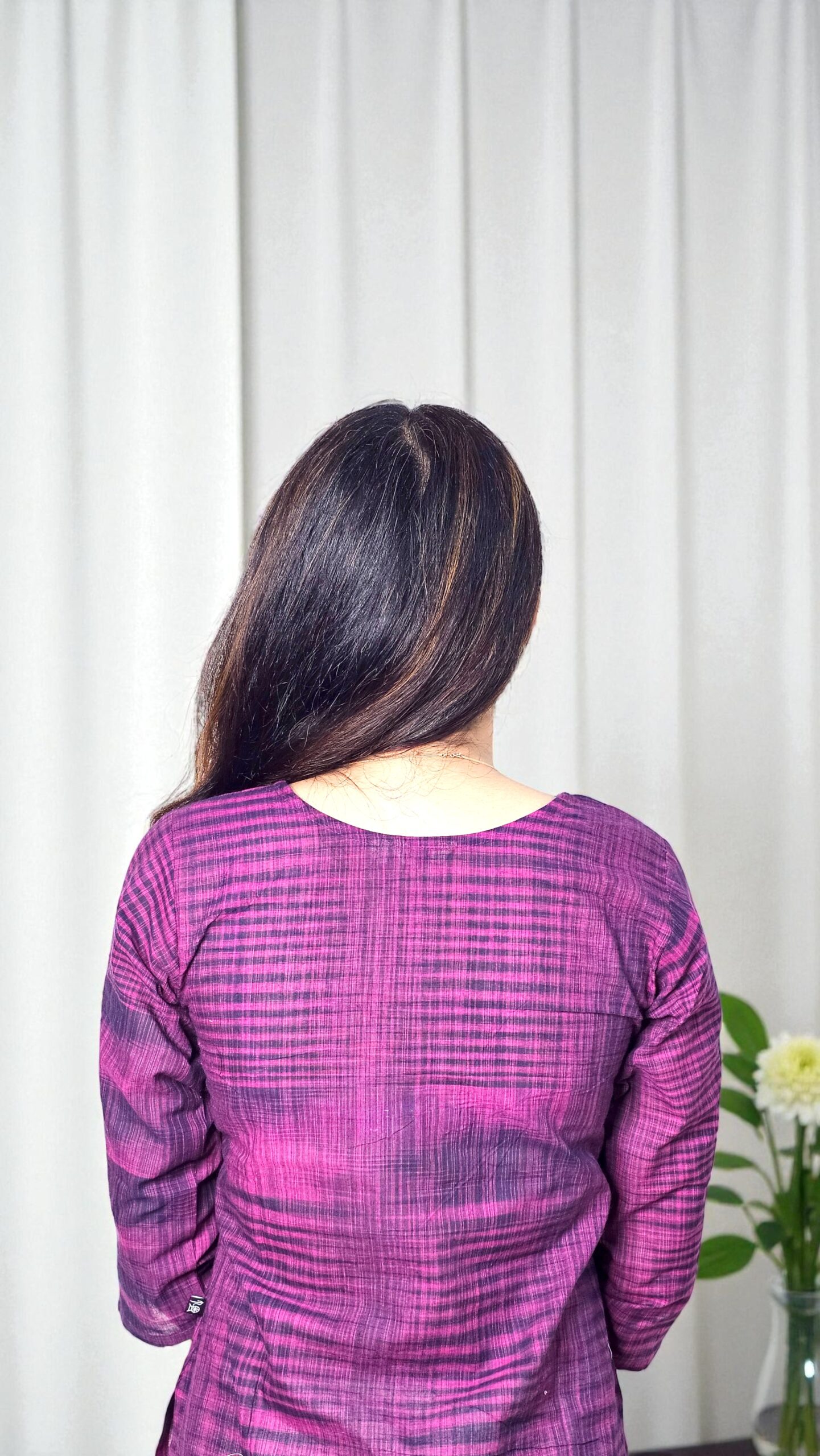 The Tavisha kurta exudes effortless charm with its rich plum hue and airy semi-transparent khadi cotton fabric. Lightweight and breathable, it drapes beautifully for both day and evening wear, combining comfort with understated elegance.
