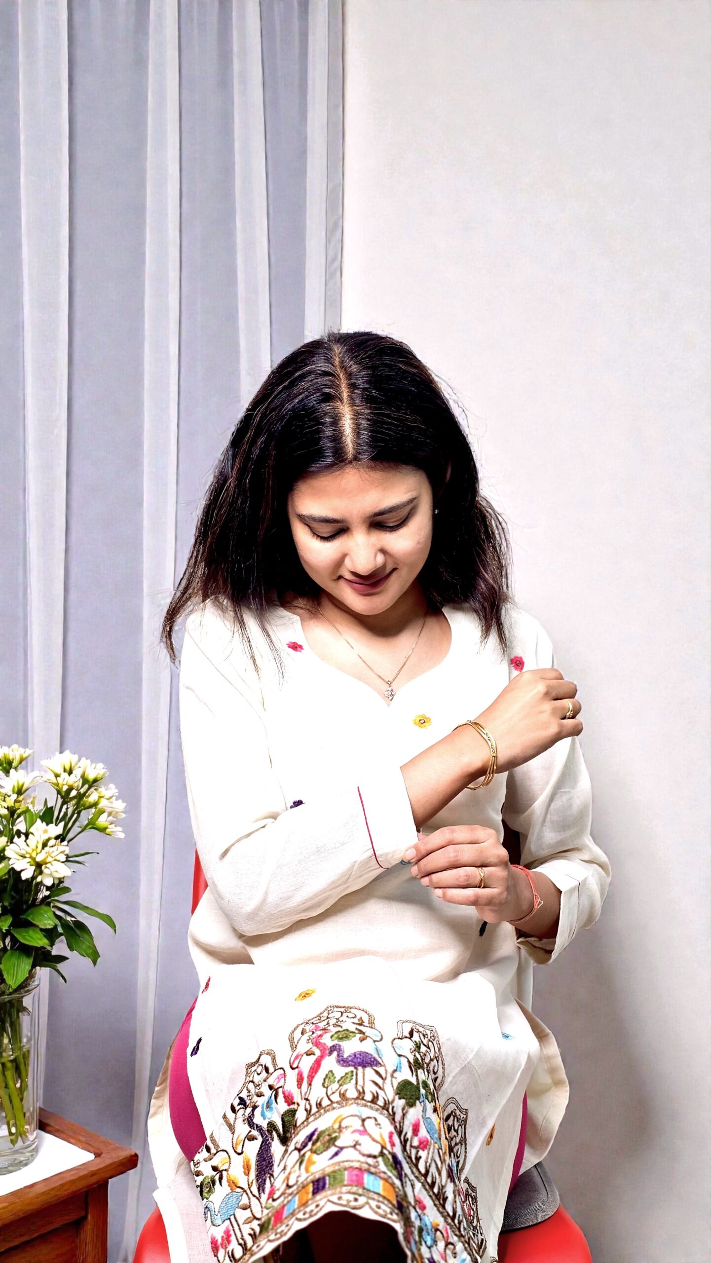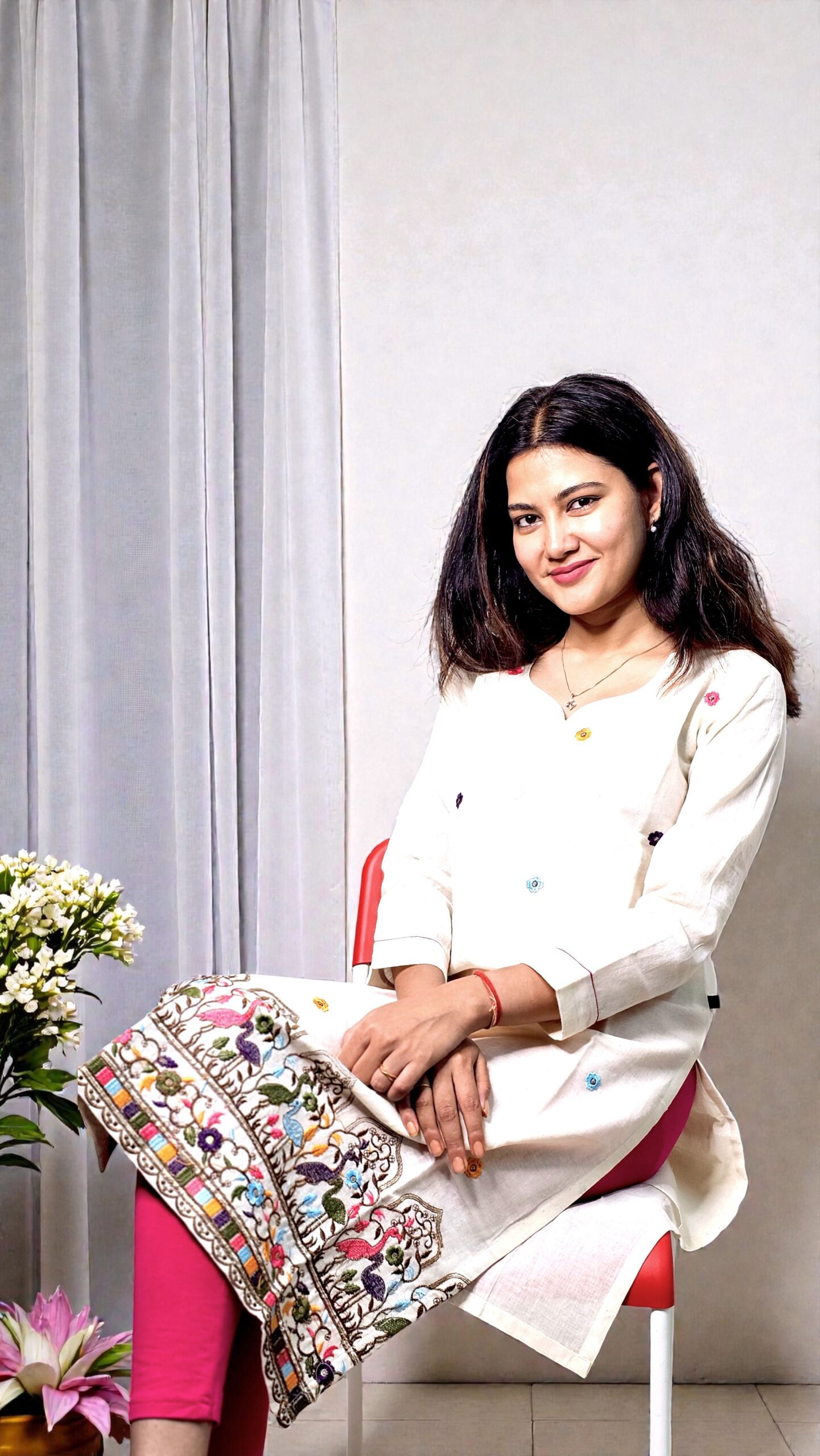 The highlight lies in its intricately embroidered hem, featuring multicolour floral and architectural-inspired detailing that adds richness and character. With its clean silhouette and refined craftsmanship, this kurta is perfect for office wear, festive mornings, casual celebrations, and graceful everyday dressing.