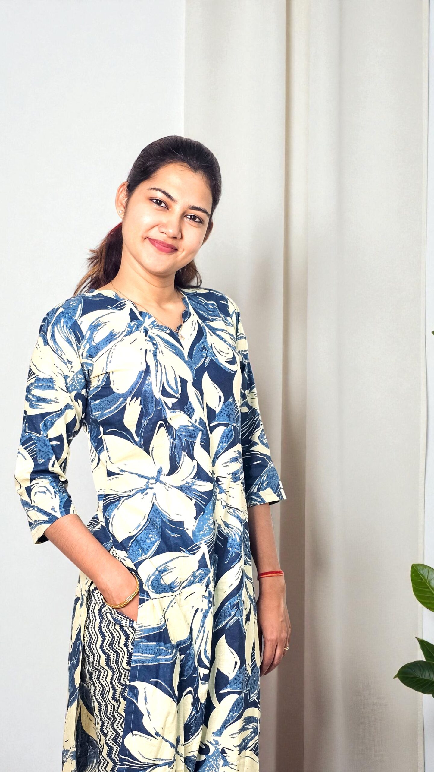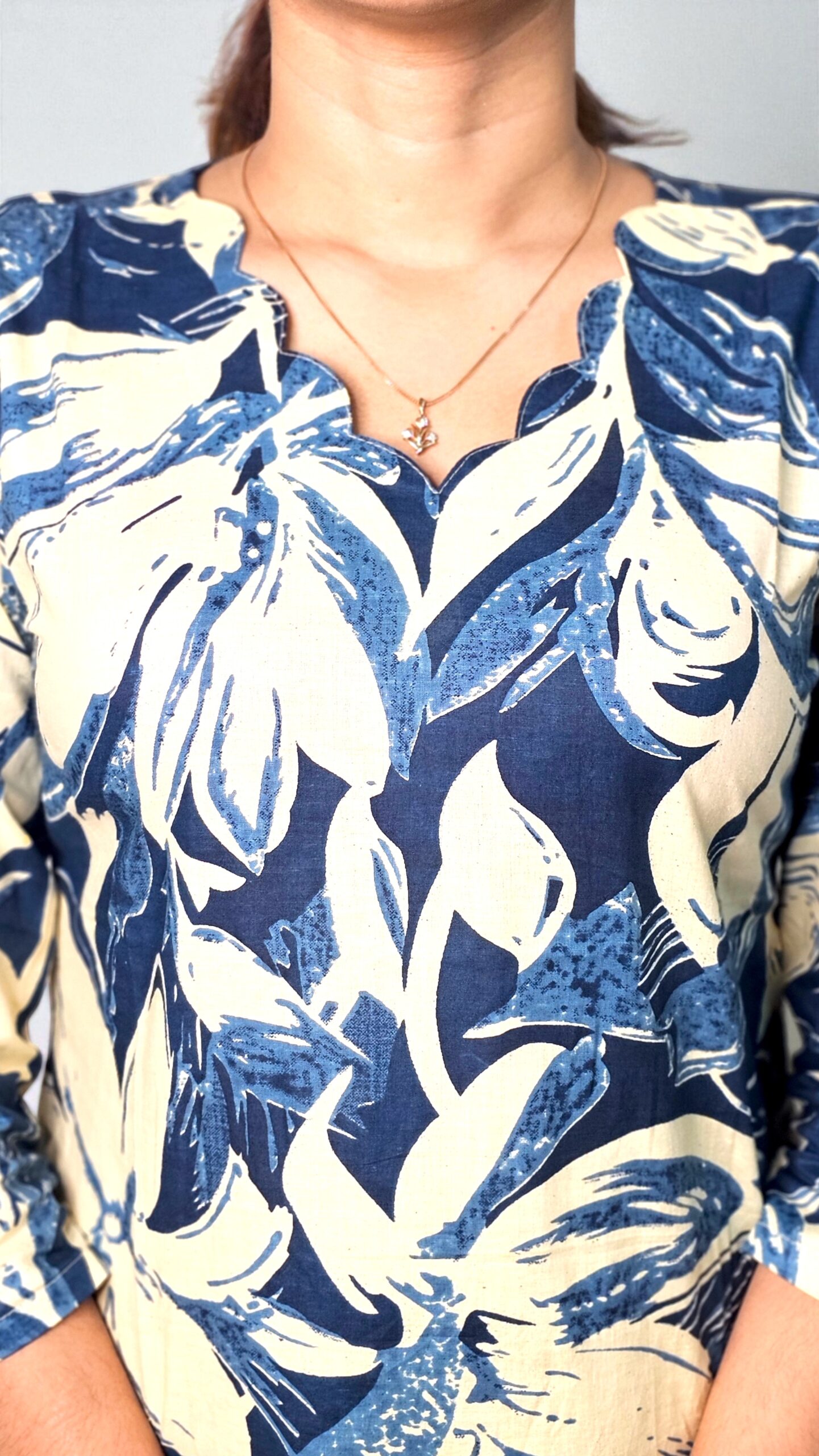 Step into modern grace with Zeraya, a stunning navy blue and cream coord set that defines chic minimalism. The kurta features a beautiful oversized leaf print paired with contrasting patterned pants for a balanced, coordinated look. Crafted from breathable cotton fabric, this set offers day-long comfort while keeping your look effortlessly refined. Ideal for office wear, brunch dates, or festive gatherings — it brings both comfort and charisma to your wardrobe.