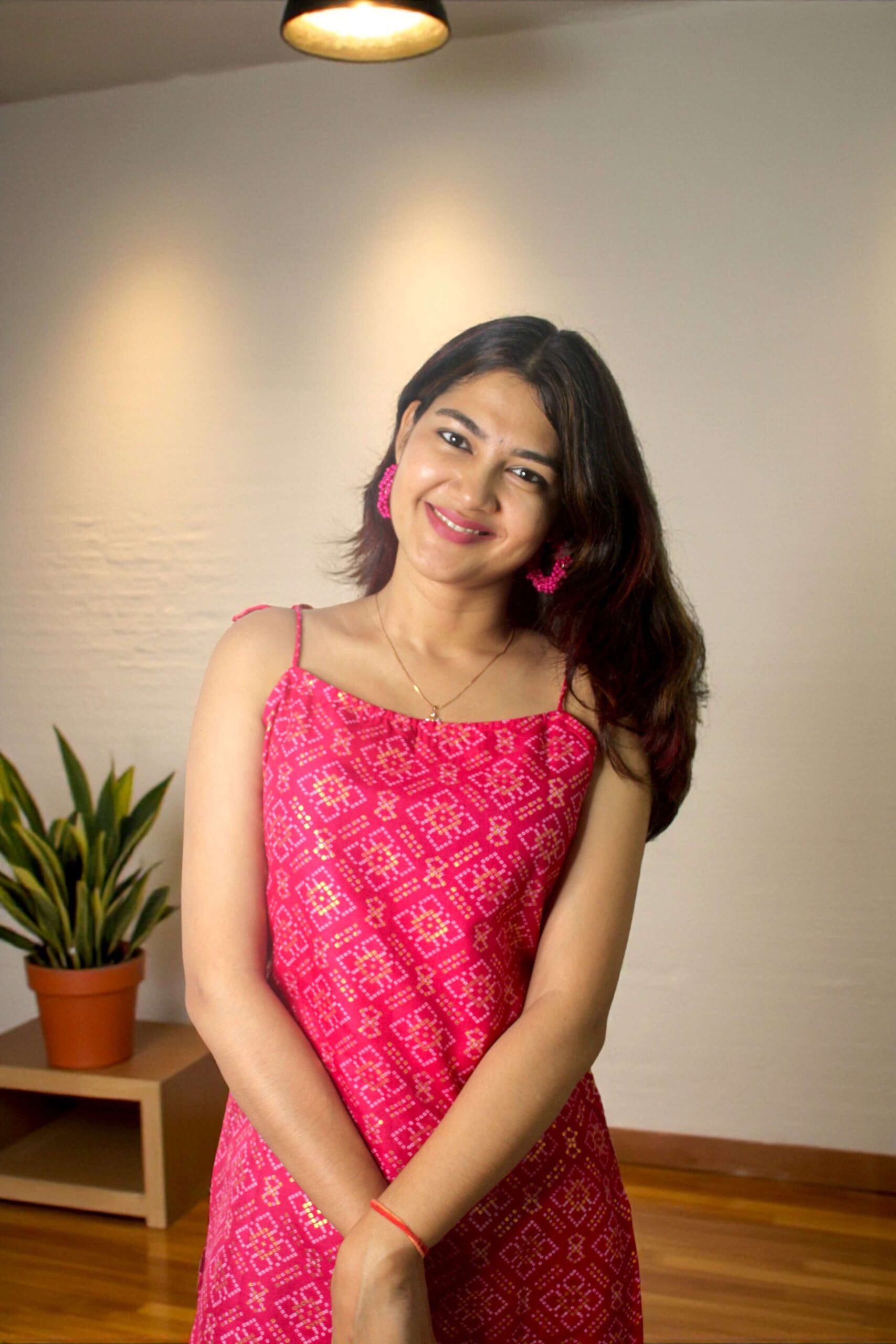A chic pink kurta top with golden geometric motifs and delicate spaghetti straps for an elegant yet easygoing look.